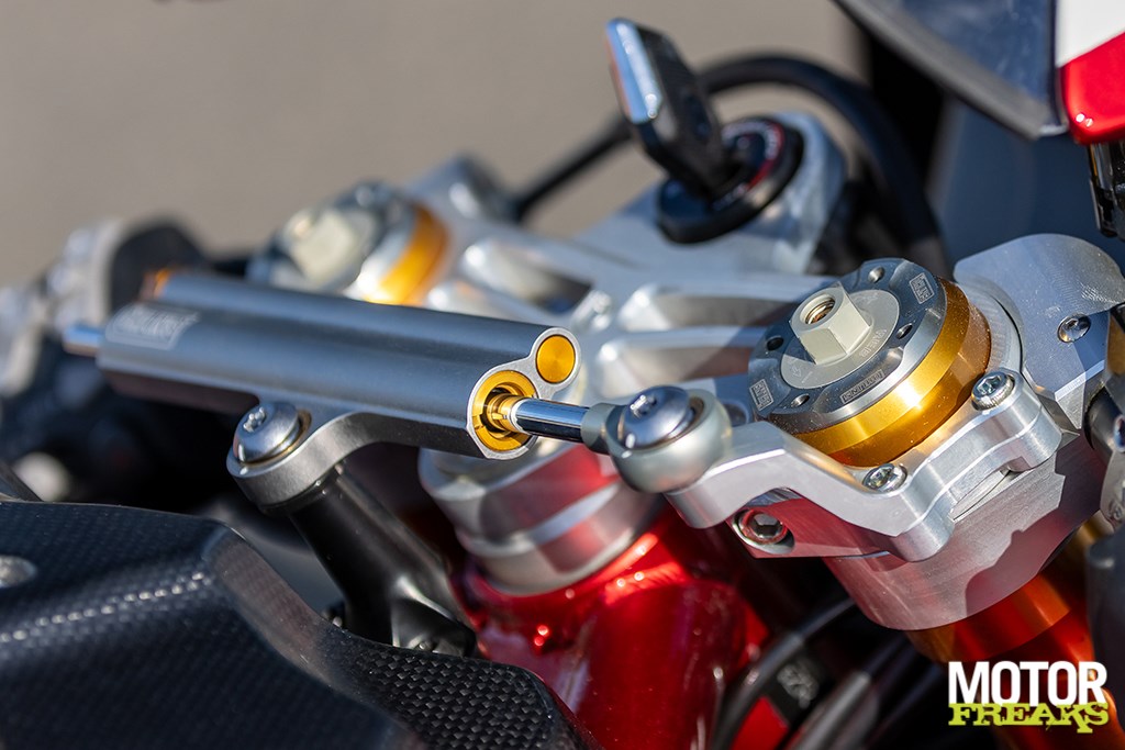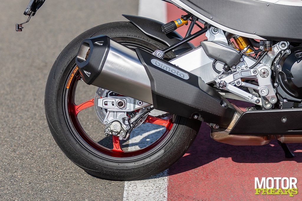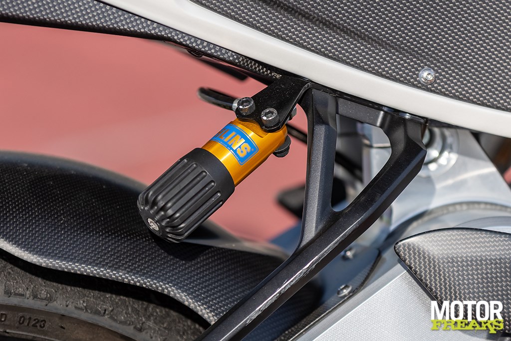 Als in Mettet gearriveerd Ron de bevindingen wordt gedeeld besluit hij voor de circuitsessies er eerst kort de straat mee op te gaan, om vervolgens onze opmerkingen te beamen. De vering aanpassen blijkt echter geen eenvoudige klus, de stelschroeven van de Öhlins TTX36 achtershock zit diep verzonken in de achterbrug en daarnaast zit het uitlaatsysteem in de weg, waardoor de kans heel groot is dat je je fikken verbrandt. Voor een merk dat naam en faam heeft gemaakt als framespecialist mag dit toch wel een aanfluiting worden genoemd. De veervoorspanning gaat daarentegen een heel stuk gemakkelijker met een losse hydraulische