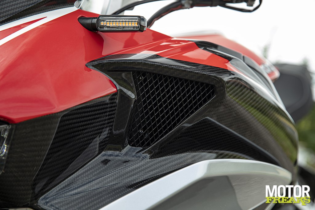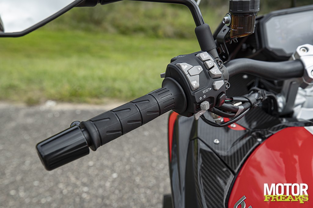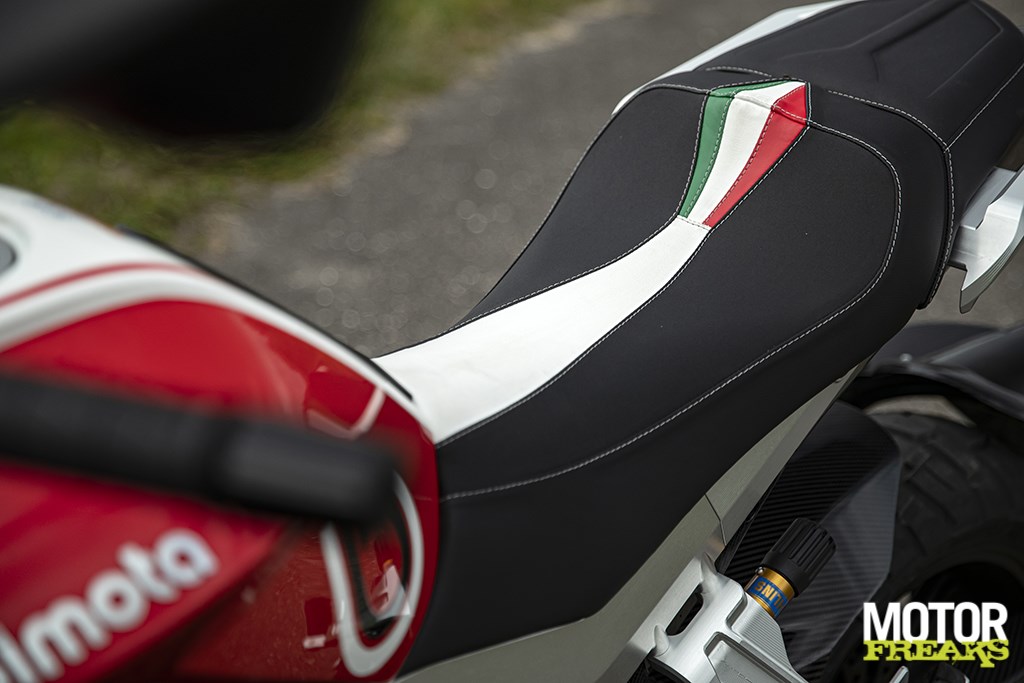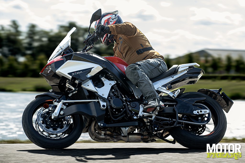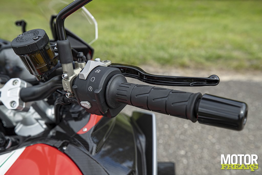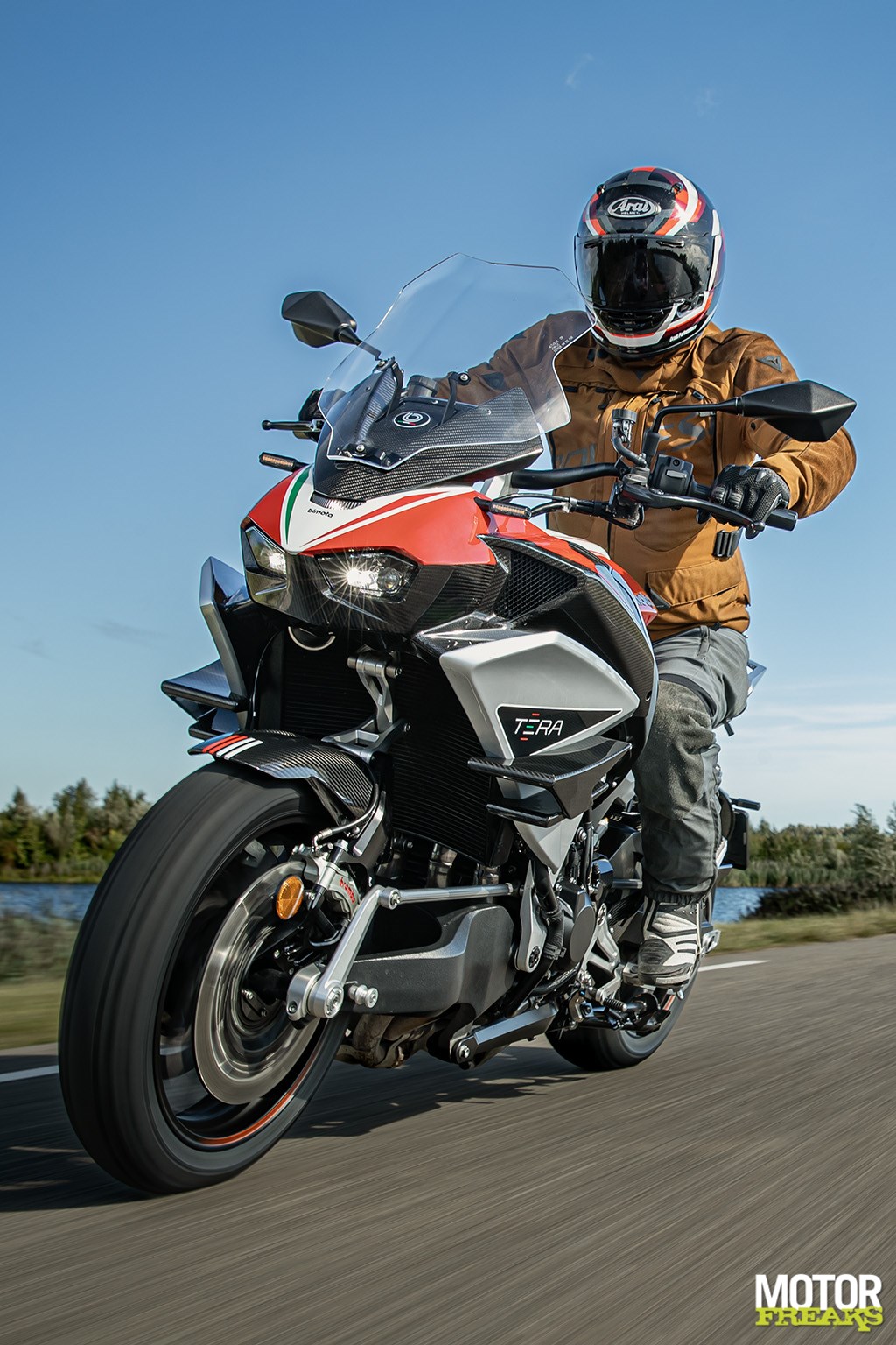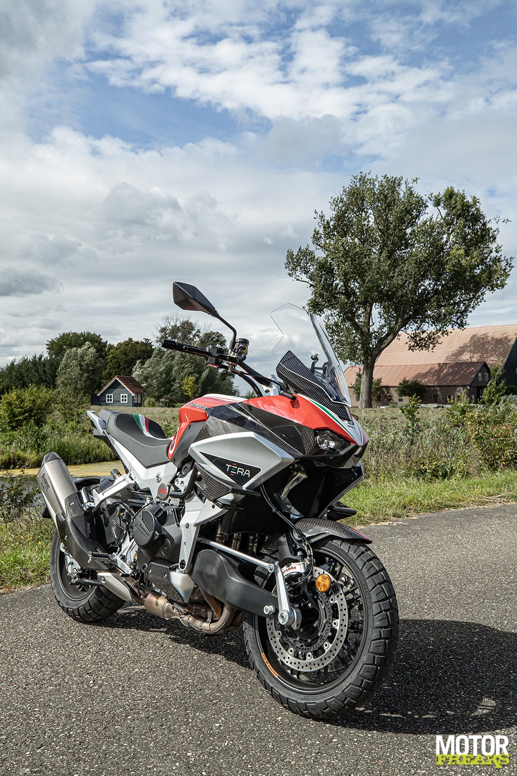 Hoe hard ik ook m’n best probeer te doen, het lukt me maar niet om – buiten het akkefietje met de Anlas banden – ook maar één kritische noot te kraken. Stuurt als de brandweer, feedback ten voeten uit en een blok dat zo explosief is als een buskruitvat. De up/down quickshifter is op geen foutje te betrappen en de slip-assist koppeling is lekker licht te bedienen, waardoor de bak heerlijk vlot en gemakkelijk te schakelen is. Qua performance steekt TERA zijn landgenoot uit Borgo Panigale, de Multistrada V4 RS, absoluut naar de kroon, die het ‘slechts’ met 180 pk moet doen, maar da’s nog geeneens z’n belangrijkste troef: dat is namelijk z’n souplesse van onderuit. Waar die RS vorig jaar pas boven de 5-6.000 toeren echt tot leven kwam (en daaronder hondsberoerd – als een Ducati V-twin – liep) is deze TERA met gemak tot de laagste toerentallen af te knijpen. Met hetzelfde gemak als dat je 200 knalt, rijd je met 30 per uur binnen de bebouwde kom.