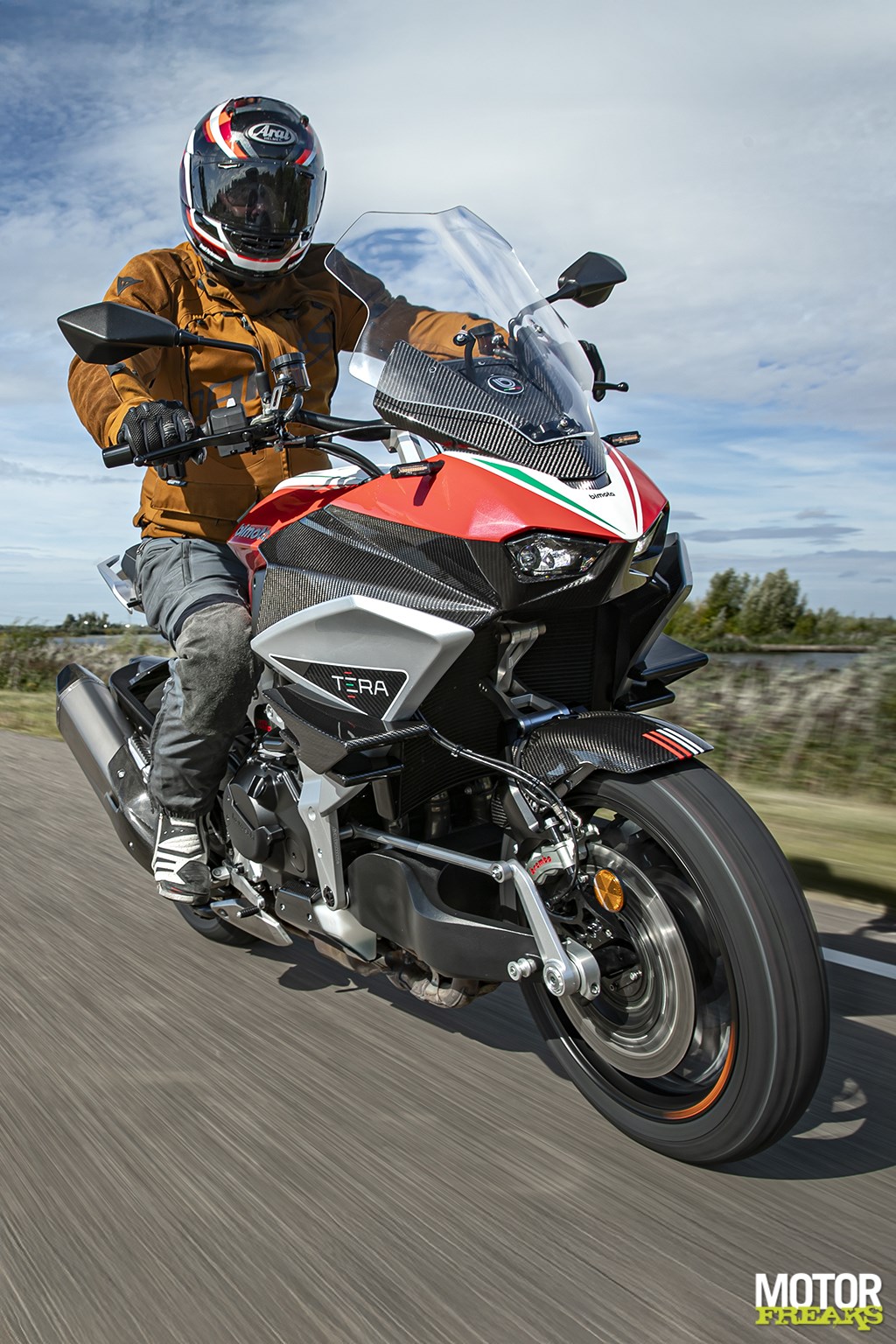 Vanaf het allereerste moment dat ik met de Tesi H2 TERA de straat opdraai ben ik enorm gecharmeerd. Niet alleen is de motor tot in het kleinste detail bizar vet mooi, het water loopt je spontaan in de mond, hij blijkt ook nog eens bizar fijn te sturen. Niet normaal, zo gemakkelijk als de TERA van richting is te veranderen. In de persinformatie werd voor wat de stuuruitslag betreft de Ninja 500 nog als referentie genoemd,