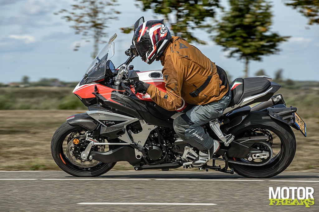 claimt een acceleratie van 0-100 in 3,5 seconden en van 0-200 in 8,2 seconden en hoewel we d’r geen stopwatch bij hebben gepakt zijn we overtuigd dat dát echt niet overdreven is. Even de kraan volledig tegen de stuit en nog voordat we met de ogen hebben geknipperd tikt de digitale snelheidsmeter in het TFT-display al 185 km/u aan. En dat terwijl we geeneens de Sport-modus hebben geselecteerd. Niet dat het qua vermogen verschil maakt met de Road-modus waarin de TERA op dat moment stond, het verschil tussen die twee zit ‘m in de gasrespons die bij Sport een tikkie directer is. Alleen in de Rain-modus is het vermogen gesmoord, maar neem van ons aan: zelfs dan ga je d'r behoorlijk vandoor.