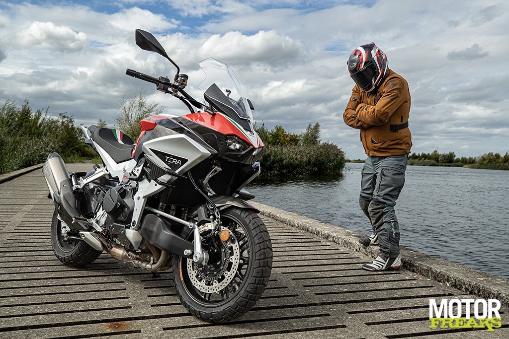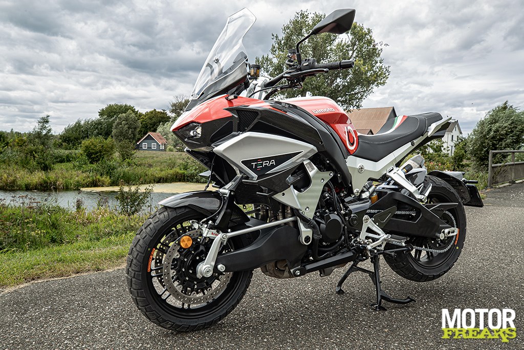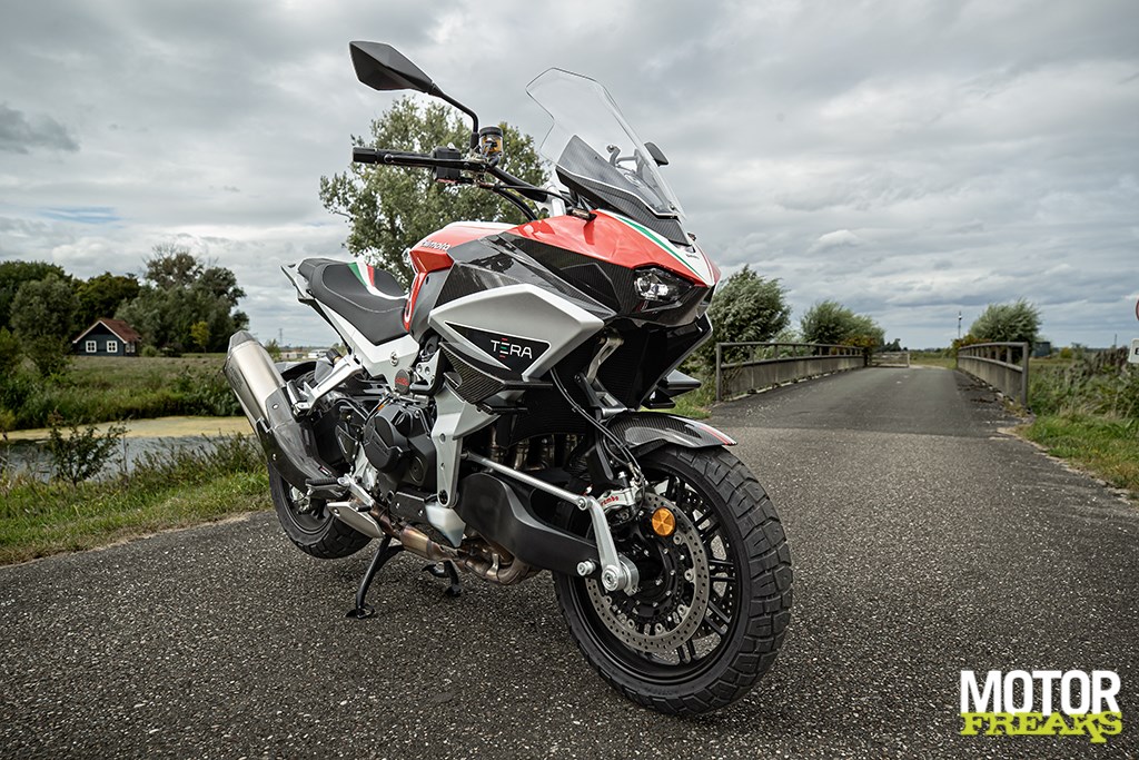 en in alle eerlijkheid: deze TERA stuurt haast net zo gemakkelijk. Zó gemakkelijk dat je tijdens het rijden never nooit het idee hebt met 215 kilo drooggewicht onderweg te zijn. Tuurlijk, met manoeuvreren voel je de kilo’s wel, maar dankzij de grotere stuuruitslag is dat wel kinderspel: zelfs op de smalle wegen van de 60-zone in de Biesbos was keren op straat geen enkel probleem.