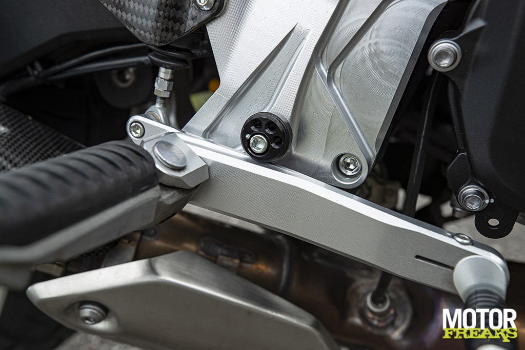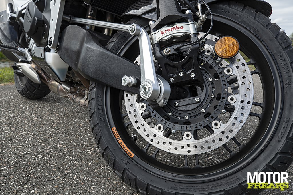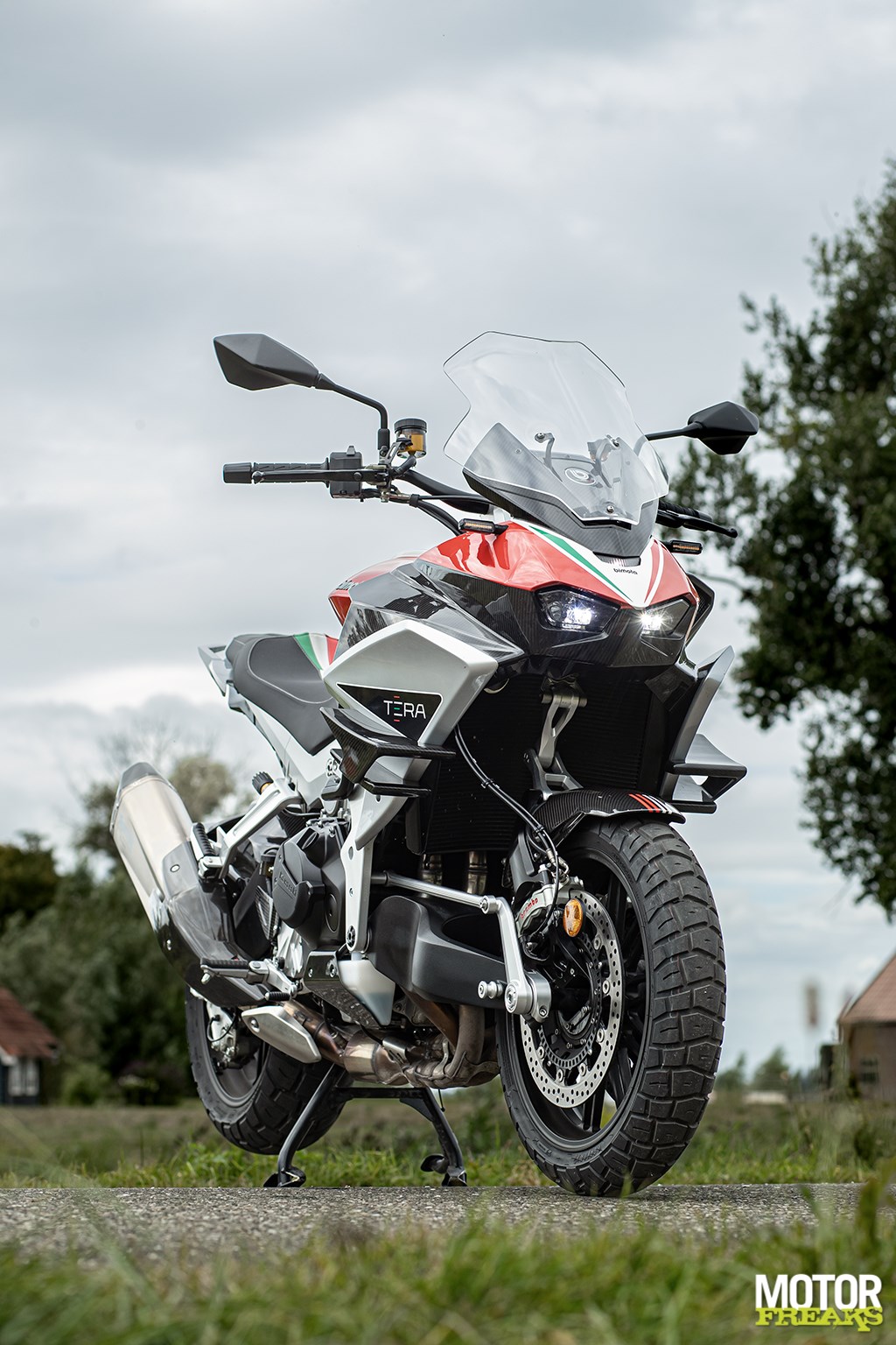 De vering wordt verzorgd door twee volledig instelbare Öhlins TTX-schokdempers die zij aan zij achter het motorblok zijn geplaatst. Het voorwiel krijgt zijn veerweg via een stevige as die via een regressief linksysteem met een Öhlins-demper is gekoppeld, goed voor 114 mm. Achter is gekozen voor een conventioneel progressief linksysteem, met 145 mm veerweg. Dat zijn slechts fractioneel hogere waardes dan de Tesi H2, maar desondanks geeft de TERA een ‘Allroad-gevoel’, dankzij het brede en relatief hoge stuur dat voor een heerlijk ontspannen zithouding heeft gezorgd. En mocht het niet 100% naar je zin zijn, zowel het stuur als de voetsteunen kunnen qua positie worden aangepast.