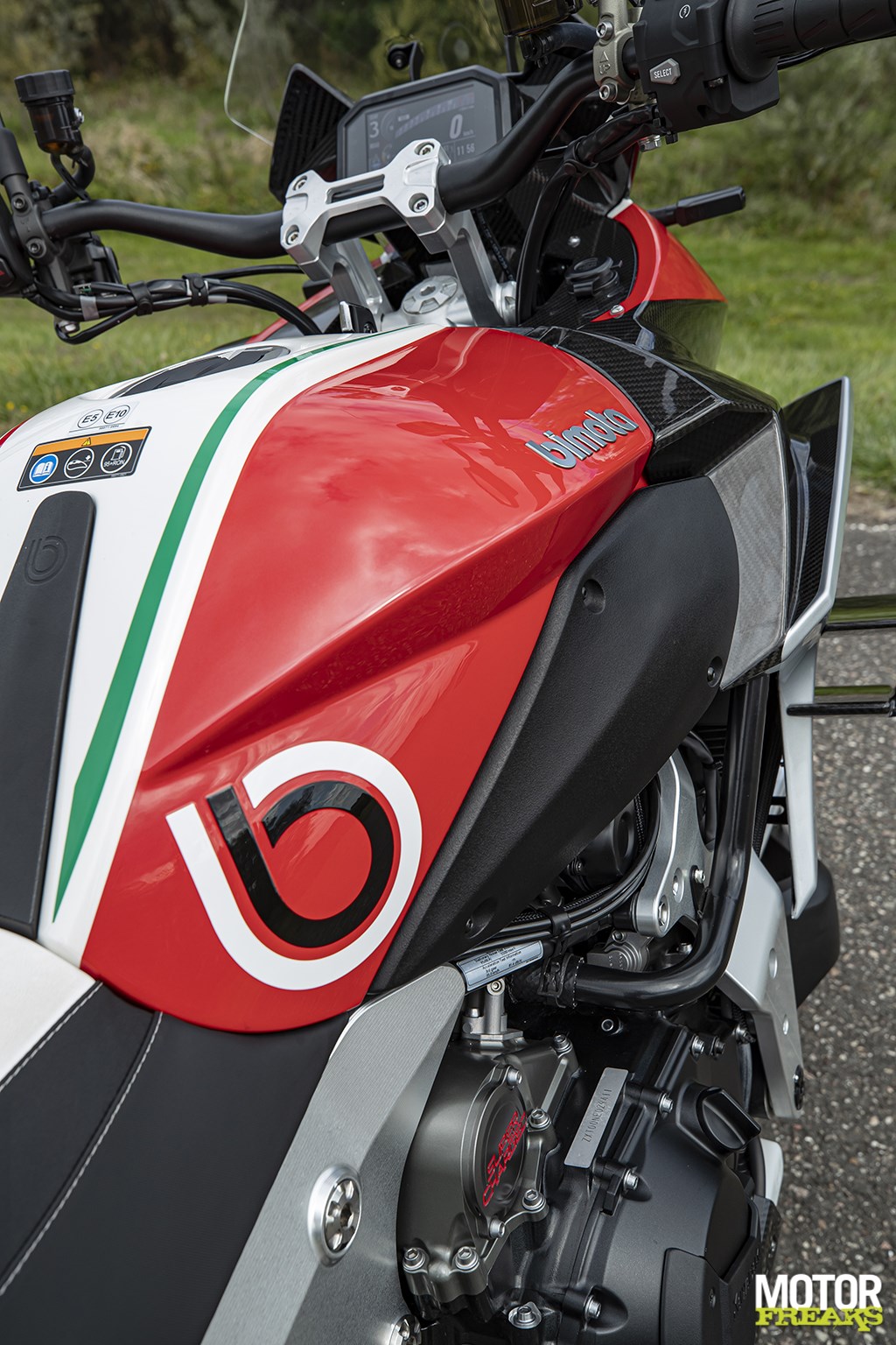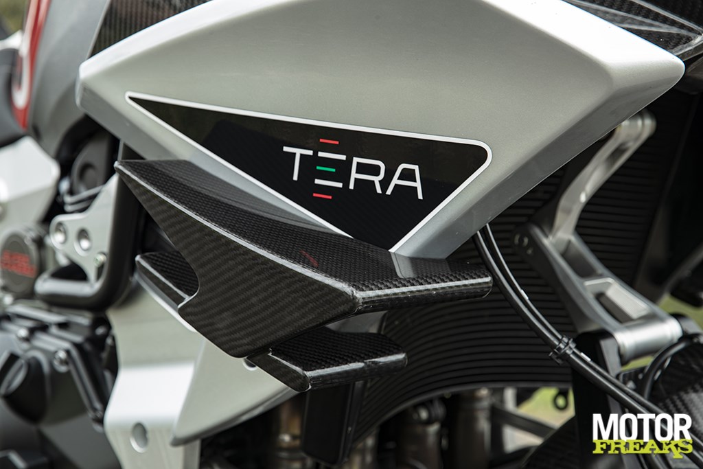 Gehomologeerd voor 270 km/u, die Anlas noppenbanden, maar je kunt er ook gewoon onverhard mee gaangewicht op de schaal, Bimota claimt een drooggewicht van 215 kilo en dat is 8 kilo meer dan de Tesi H2. Wat ergens best opmerkelijk is, gezien het feit dat de stuurinrichting van de Tesi H2 TERA uit minder onderdelen bestaat. Daar staat tegenover dat het subframe zal zijn verzwaard om plaats te bieden aan de duopassagier, en dat de TERA standaard met een middenbok is uitgerust.