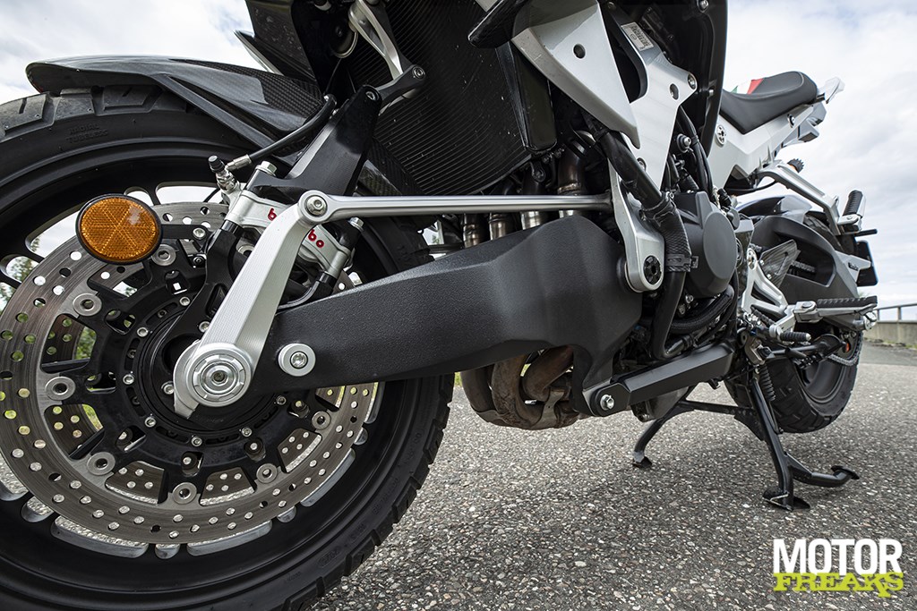 Het gemak waarmee de TERA zich van richting laat veranderen is niet het enige waar ik enorm van onder de indruk ben. Minstens zo indrukwekkend is het gevoel dat Bimota in de Tesi voorwielophanging heeft gecreëerd. Alsof je met een conventionele voorvork aan het rijden bent, maar dan zonder de nadelen daarvan omdat sturen en remmen van elkaar geschieden zijn. De voorkant duikt, maar slechts minimaal en precies genoeg om je dat vertrouwde 'voorvork-gevoel' te geven, terwijl oneffenheden perfect worden geabsorbeerd. De twee achter het blok geplaatste TTX36 monoshocks (eentje voor het voorwiel en eentje voor het achterwiel) geven een bizar goed gevoel en veel feedback over wat er onder je gebeurt. Daar komt bij dat dankzij de Tesi voorwielophanging het voorwiel te allen tijde zijn volledige veerweg kan benutten. Ongeacht dus de stuuruitslag. Bizar.