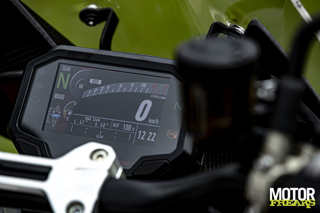 Nu we ’t toch over de elektronica hebben: Bimota heeft naast het blok de volledige ECU en IMU van de Z H2 overgenomen. Dat betekent dat de TERA over 4 geïntegreerde rijmodi beschikt (Rain, Road, Sport en Rider), waarbij vermogen, gasrespons en tractiecontrole hellingshoek afhankelijk worden geregeld. Of zoals Team Green het zelf noemt: Kawasaki Cornering Management Function. Uiteraard beschikt de TERA over Kawasaki Launch Controle Mode, Kawasaki Engine Brake Control en het Kawasaki Intelligent anti-lock Brake System KIBS. En voor we het vergeten: een up/down quickshifter (KQS – Kawasaki Quick Shift), cruise controle