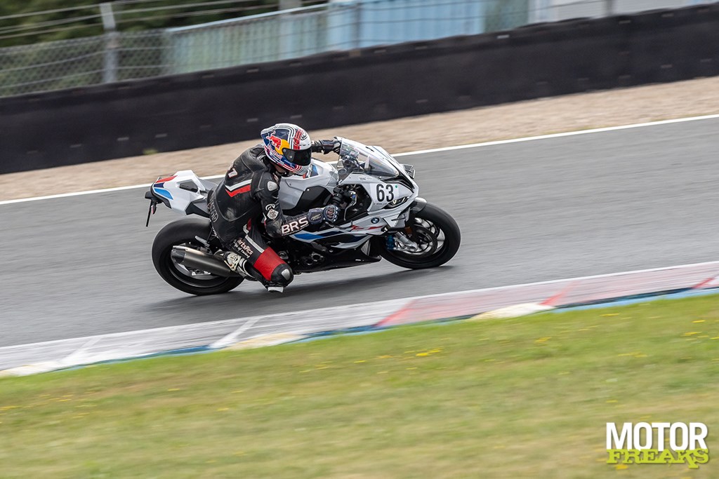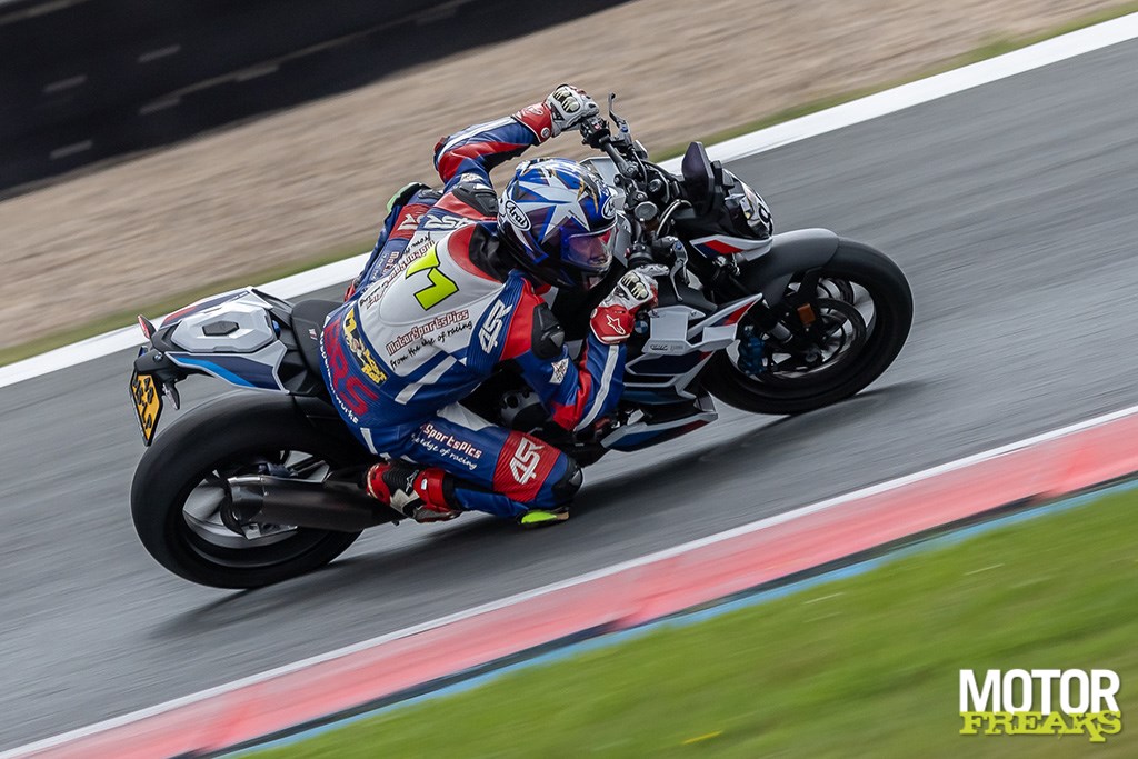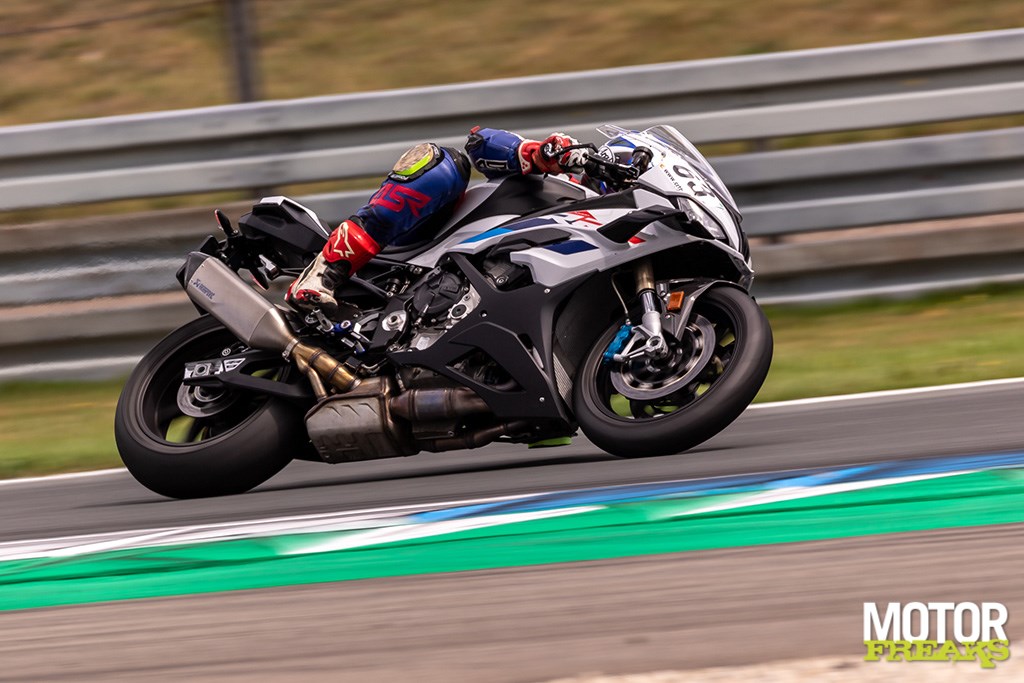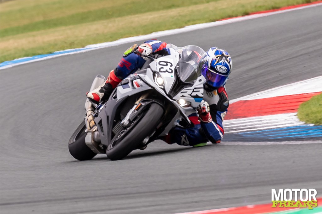 Ik begin op de S 1000 RR en gebruik de eerste sessie vooral om te wennen aan de motor, het stuurgedrag, de wijze waarop de rem aangrijpt etc. etc. en ik moet eerlijk bekennen dat dit vanaf de eerste ronde meteen super vertrouwd en stabiel aanvoelt. De motor pakt mooi en lineair op, en de eerste keer dat ik de volle 210 pk aanspreek als ik in 2e versnelling vanuit de Strubben de Veenslang op knal kan ik een vette smile niet onderdrukken terwijl de elektronica er keurig voor zorgt dat het voorwiel niet verder dan enkele centimeters boven het warme asfalt zweeft. Als een kogel knalt de RR er vandoor, maar de vermogensopbouw gaat zo geleidelijk