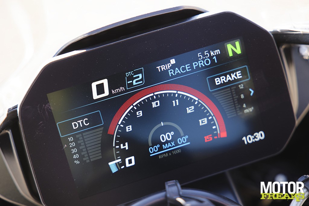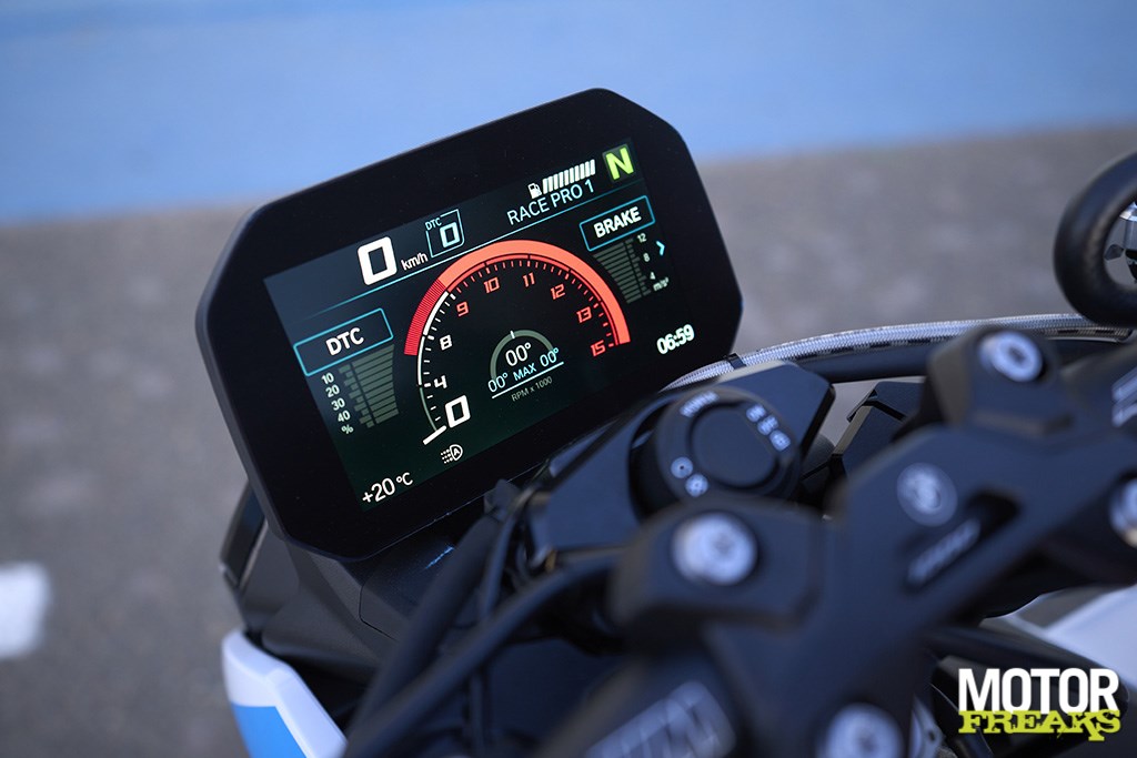 De motorrem is in Race Pro duidelijk nadrukkelijker aanwezig waardoor de rempunten nog wat metertjes opschuiven en het effect van het aanpassen van de tractiecontrole (14 standen van +7 naar -7, wat al rijdend heel makkelijk is te doen en in het grote TFT kleurenscherm zeer goed wordt weergegeven) was zeer goed merkbaar. Bij +7 grijpt de TC het snelste in, bij -7 is dat -uiteraard - het minste. De eerste keer min cijfers selecteren voelt toch een beetje ongemakkelijk moet ik je bekennen, geen idee waarom dit niet gewoon stand 1 tot 14 is geworden,