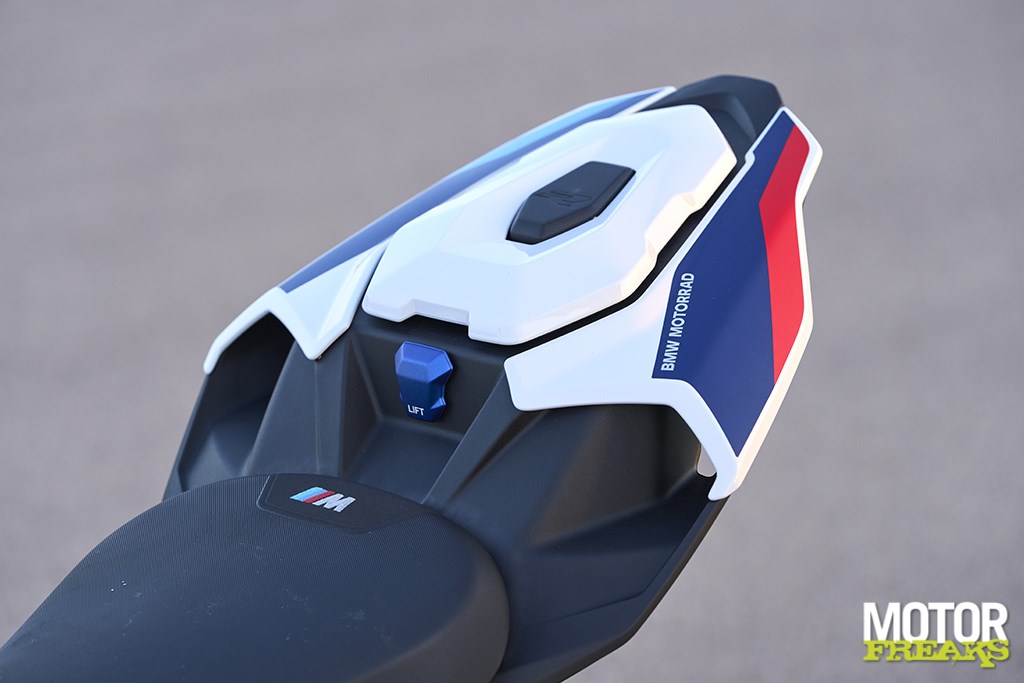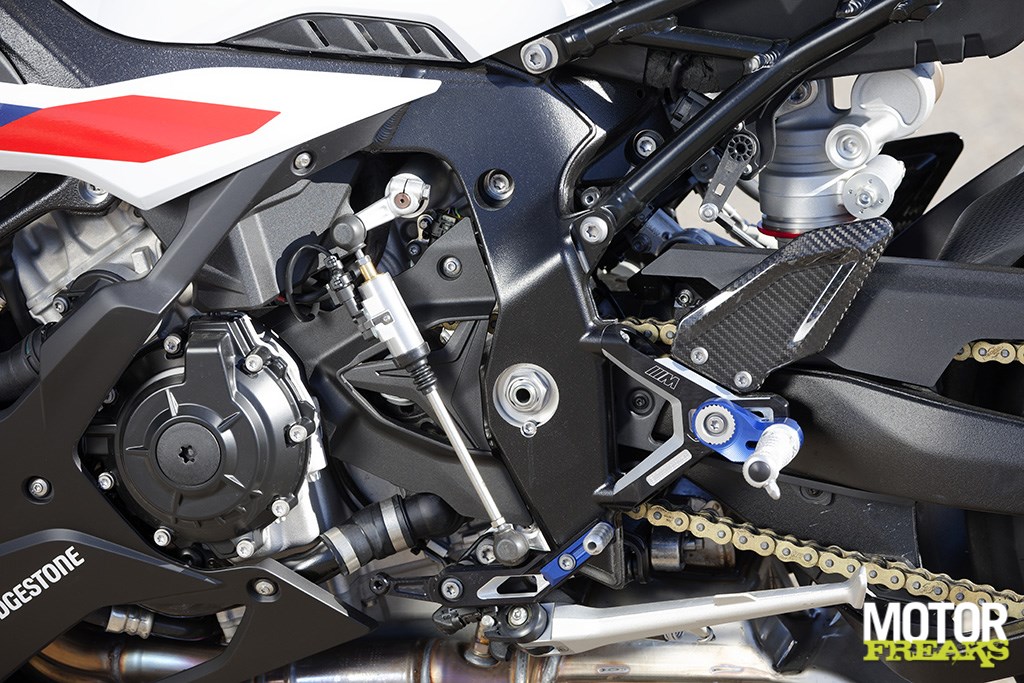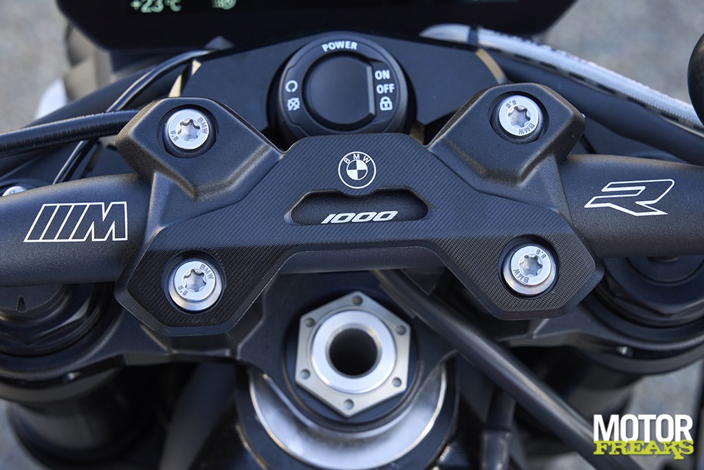 De S 1000 RR is voorzien van het M-pakket (€ 2.399,00) met daarin naast de M-sport kleuren het M Sport zadel en M Gesmede velgen, het Carbon pakket (€ 2.012,00), het M Stijlpakket (€ 417,00), het Dynamic pakket (€ 1.423,00) met daarin verwarmde handvatten, cruise control, Rijmodi Pro en DDC Dynamic Damping Control, het Race pakket (€ 950,00) met daarin de Akrapovič einddemper en de M Endurance Ketting, een alarm (€ 249,00), RDC Bandenspanningscontrole (€ 249,00), een cover voor de duozit (€ 106,00) en Intelligent Emergency Call eCall (€ 367,00). Da’s bij elkaar opgeteld € 33.134, wat niet alleen bijna 9.000 euro duurder dan de basisprijs, maar ook nog eens een flink stuk duurder dan de M 1000 R, die op het alarm na volledig standaard is en dus een consumentenprijs van