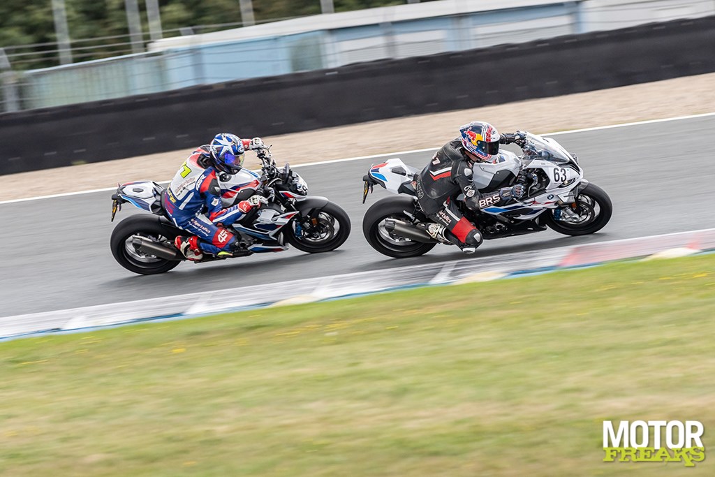 We starten vandaag met beide motoren in de Race Mode, een modus speciaal voor circuit waarbij alle elektronische rijhulpmiddelen als wheeliecontrole, motorrem, etc. door BMW zijn vastgelegd en niet door de rijder kunnen worden gewijzigd. Het in race mode niet kunnen wijzigen van de setup geldt eveneens voor de elektronische vering waarmee beide motoren zijn uitgerust, dus we willen bij beide motoren eerst eens kijken wat BMW voor ons heeft vastgelegd in de elektronica. Op beide fietsen passen we de stand van het remhendel aan op persoonlijke voorkeur en ondanks de talloze instelmogelijkheden van de remschakelset vertrekken we beide met de standaard instellingen en hebben ook geen enkele behoefte gehad om dit tijdens deze dag nog te veranderen, beide fietsen zitten en voelen als gegoten.