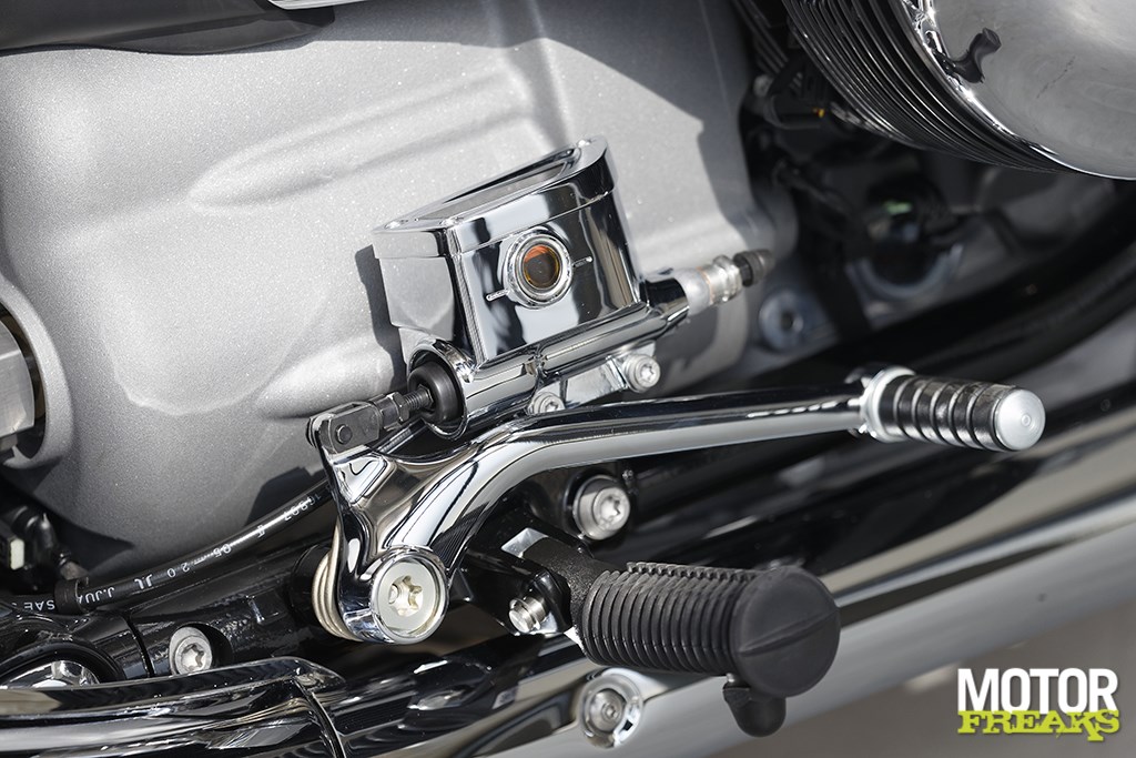 Of de hoeveelheid trillingen die BMW in het blok heeft gelaten toereikend is of niet valt over te discussiëren – van Ed had het wat erger gemogen – maar wat zonder meer wel een teleurstelling is, is dat het geluid van de Big Boxer behoorlijk tam is. Nu is dat niets wat Vance & Hines kan oplossen, maar de kans is wel dat de balans dan meteen de andere kant opgaat. Het blok pakt vanaf 1.500 toeren al behoorlijk sterk op, maar om ‘m echt van z’n plek te laten gaan moet je digitale toerenteller boven de 2.000 toeren houden. Tot 2.400 toeren voel je trillingen in het zadel, maar daarna vlakt het mooi af totdat je richting de toerenbegrenzer van 5.750 tpm gaat. Hoewel je daar nooit hoeft te komen. De Big Boxer levert een topvermogen van 91 pk bij 4.750 toeren, terwijl het maximum koppel van 158 Nm al bij 3 duizend toeren wordt geleverd. Belangrijker nog is dat tussen 2 en 4 duizend toeren meer dan 150 Nm koppel beschikbaar is, waardoor de R 18 ontzettend schakellui te rijden is. En dat is maar goed, want ondanks dat de versnellingsbak op zich de beste is van alle boxers waar ik tot nu toe op heb gereden – precies, snel en zonder de kenmerkende klak van neutraal naar 1 en van 1 naar 2 – is het vinden van de schakelpook een heel ander verhaal.