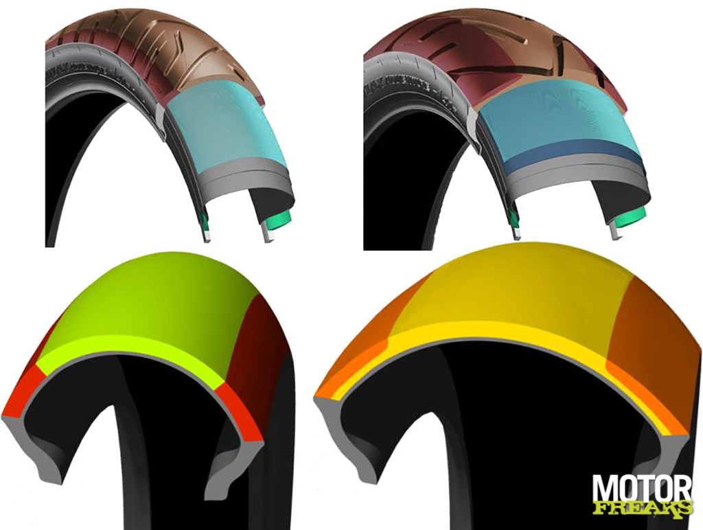 De 3LC multi compound opbouw is bij de achterband anders dan bij de voorbandWant wat dat aangaat lijken alle presentaties op elkaar. “De nieuwe A41 is op alle punten beter dan de A40,” begint Bridgestone’s woordvoerder de presentatie van de nieuwe band die dat even later met een fantastisch mooi spinnenweb diagram nog eens extra onderstreept en dat waren inderdaad nagenoeg exact dezelfde woorden (en diagram) als drie jaar geleden bij de presentatie van de A40, destijds de opvolger van de Battle Wing.