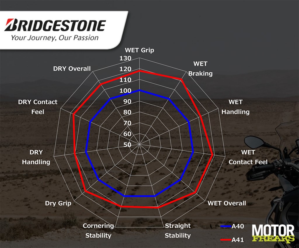 Met de A41 richt Bridgestone zich op de avontuurlijke motorrijder die een onverhard geitenpad niet schuwt en dat ook nog eens met volle bepakking en duopassagier wil doen. Volgens Bridgestone is naast de hierboven genoemde zaken ook de stabiliteit op hoge snelheid een van de verbeterpunten geweest, omdat dat hét zwakke punt is van bijna alle Allroads, zeker bij volle bepakking en duopassagier.