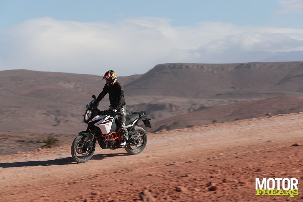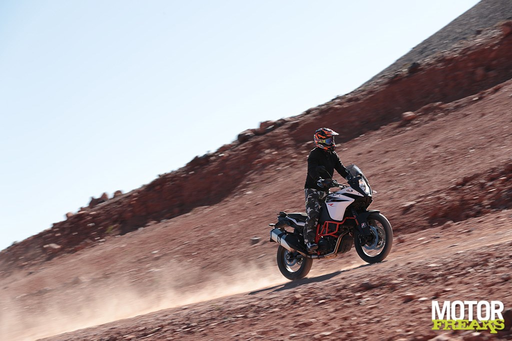 Nu ben ik niet bepaald een ervaren offroad specialist, maar het gemak waarmee de 1090 Adventure zich over de onverharde wegen laat sturen en de grip die door de banden wordt gerealiseerd is op z’n zachtst gezegd indrukwekkend te noemen. Het enige wat de KTM van z’n à propos weet te brengen is de sterke zuidenwind die met alle macht probeert ons van de weg te blazen. Voordeel van de wind is dat het stof niet blijft hangen maar direct wordt weggeblazen, waardoor er te allen tijde goed zicht naar voren is.