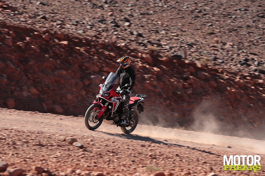 Bij de fotostop switch ik via een kort uitstapje op de Africa Twin over op de nieuwe Tiger 1200, waarmee ik eind vorig jaar nog offroad door de droge rivierbeddingen van Almeria heb geknald. Nu was dat Spaanse rivierzand een stuk losser dan deze ondergrond en reden we toen met noppenbanden met lage bandenspanning, maar waar ik me toen meer een enorme prutser voelde heb ik het nu prima naar m’n zin en eet de Tiger uit m’n hand. Ondanks onverhard kan er voor nog behoorlijk hard worden geremd voordat het ABS ingrijpt en