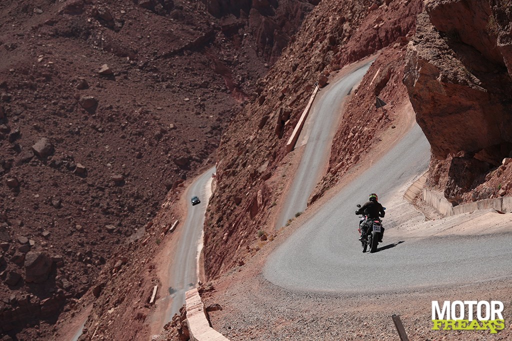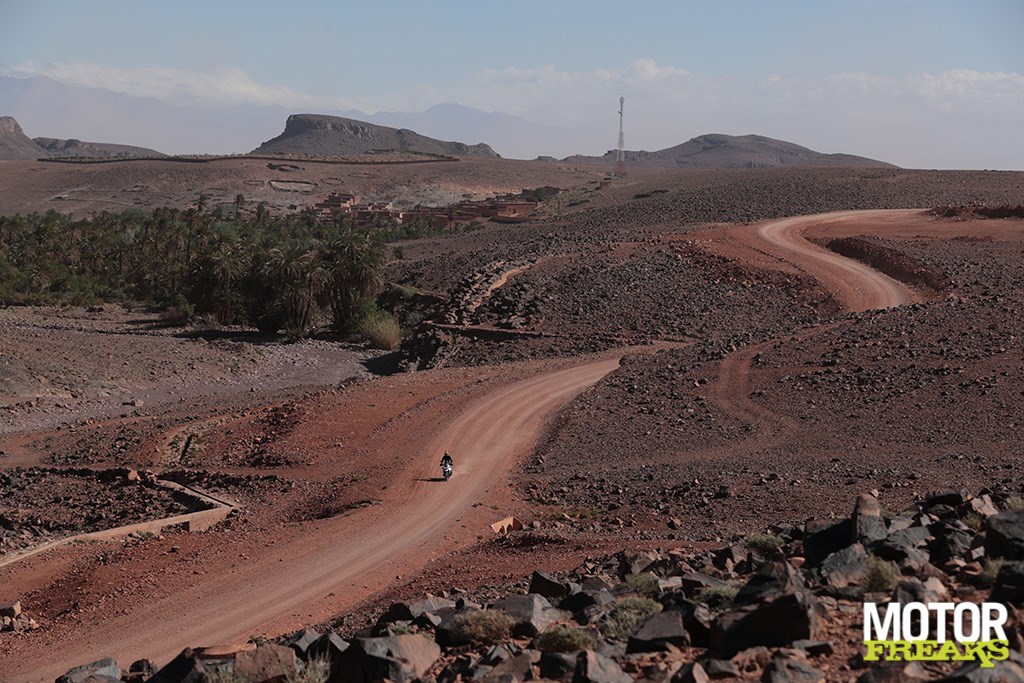 De geweldige route offroad smaakt duidelijk naar meer en stiekem zijn we dan ook teleurgesteld als de voorrijder ons mededeelt dat de route vanaf nu alleen nog maar onroad zal zijn. Van de Tiger 1200 stap ik over op de 1290 Super Adventure R en, om niet veel later op een prachtige bergweg door dit pittoresk onherbergzame gebied met zo nu en dan een nederzetting met geiten en palmbomen nog meer onder de indruk te raken van de A41. Ondanks dat ik m’n stinkende best doe alle 160 beschikbare paarden van de Super