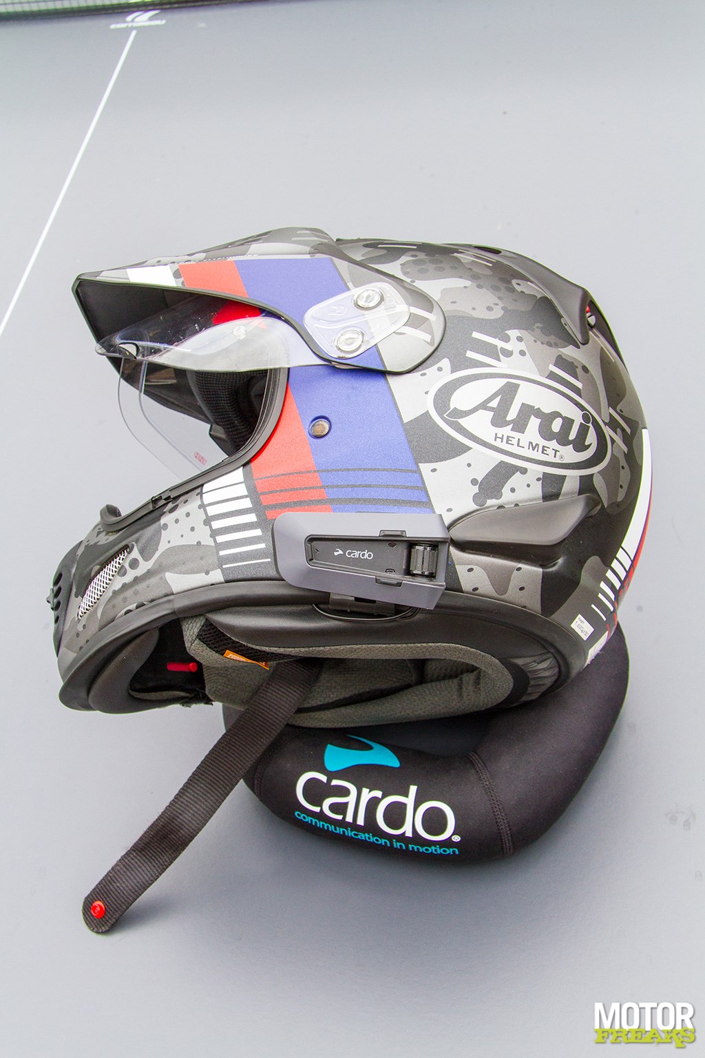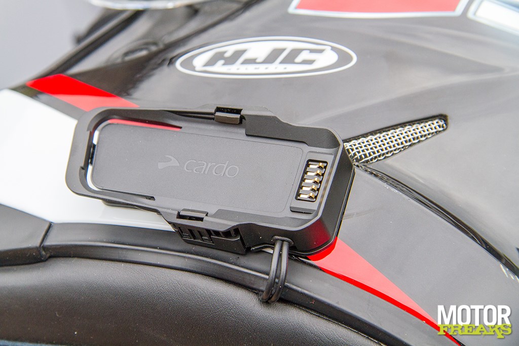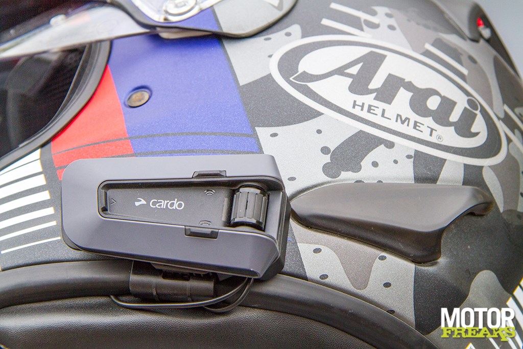 Uiteraard wilde Motorfreaks deze communicatie zelf wel eens uitproberen, dus was Cardo zo vriendelijk om een Packtalk Edge Duo-set op te sturen. Duo, want in je eentje communiceert het wat lastig. Het inbouwen van de duoset is vrij eenvoudig. Er worden twee soorten bevestigingsbeugels meegeleverd: een om de nieuw ontwikkelde houder aan de helm te plakken, een om hem aan de helm te clippen. De waterdichte Edge-unit “zuigt” zichzelf daar magnetisch aan vast. Muurvast! En toch kun je hem er – als je het trucje doorhebt - wel gemakkelijk afschuiven om hem op te laden, wat overigens pas na 13 uur gebruik hoeft. Ook de microfoon kan netjes worden weggewerkt. Spraak is goed te verstaan, mits je de geluidsinstelling op "vocal" hebt gezetDe JBL-speakers gaan uiteraard in de oorschelpen: ze zijn ietwat dikker dan mijn oude, maar in mijn Arai Tour X-helm past het prima. Dat is wel iets om te checken voor je hem aanschaft, niet alle helmen hebben riante oorschelpen! Ik heb een Bell helm waar ze bijvoorbeeld niet in passen, in de HJC van mijn zoon gaat het net.