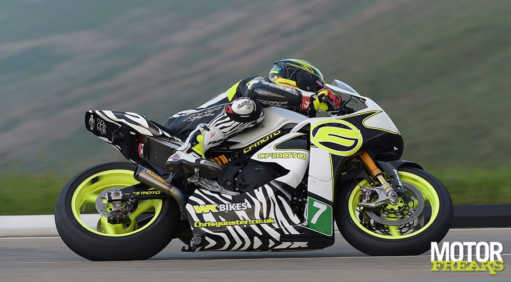 De mogelijkheid om Gary Johnsons Made-in-China Supertwin te rijden was op het prachtige 3,47 kilometer lange Cadwell Park circuit, wiens Woodland sectie met wheelie-vriendelijke ‘The Mountain’ een mini-TT circuit is. Dat was onder het toeziend oog van de man die voor de ontwikkeling van de machine verantwoordelijk is geweest, de in Grimsby gevestigde tuner Chris Gunster, een voormalig 125/250cc coureur op Brits nationaal niveau. “We hadden veel met Gary gewerkt om zijn Superstock en Supersport machines voor de TT te prepareren”, zei Gunster. “Dus toen hij besloot om de CFMoto Lightweight