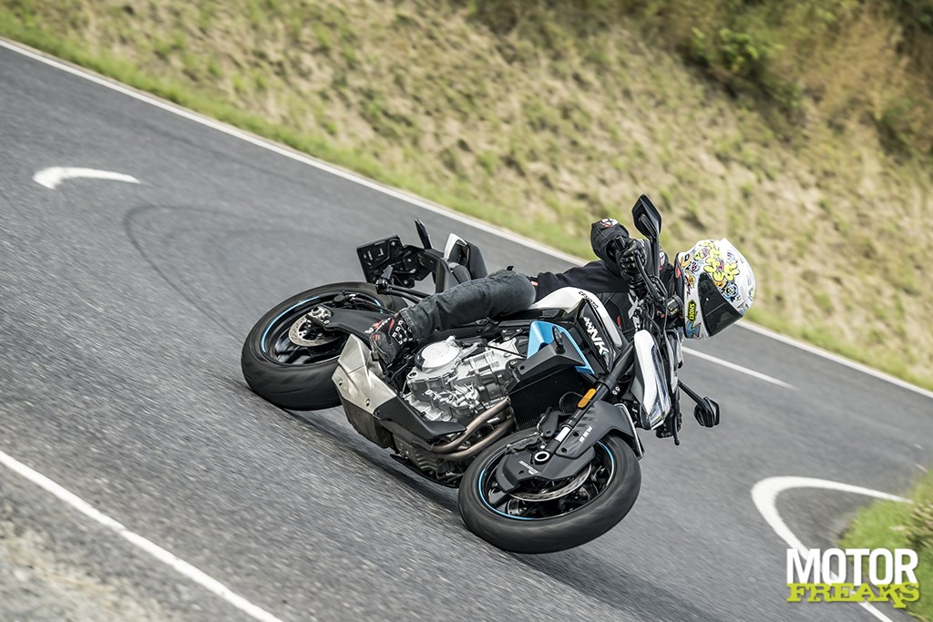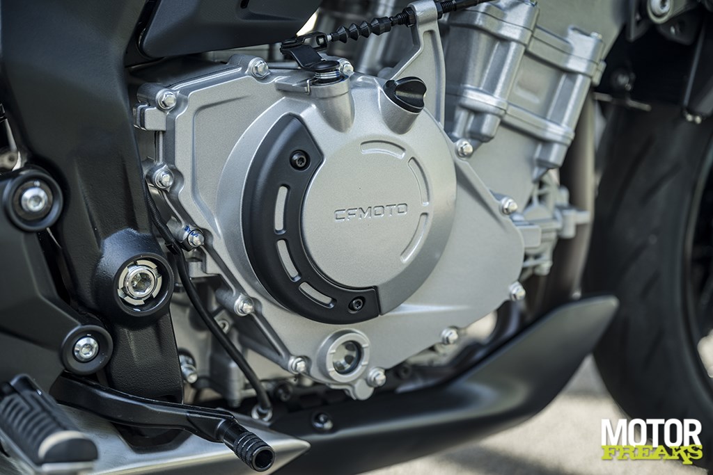Om de motor voor een zo scherp mogelijke prijs aan te kunnen bieden heeft CF gekozen voor kabelbediende gaskleppen in plaats van het tegenwoordig meer gebruikelijke ride-by-wire, maar dat heeft niet in een abrupte initiële gasrespons geresulteerd. Nadeel van een conventionele gaskabel is dat je geen rijmodi kunt toepassen (hoewel je natuurlijk kunt debatteren in hoeverre rijmodi bij 70 kW zinvol zijn), noch een up/down quickshifter, cruise controle of een 6-assige IMU voor hellingshoek afhankelijke elektronica. In plaats daarvan heeft CFMOTO een ‘alleen up’ quickshift voorzien, die zelfs bij lage toerentallen mooi werkt, maar niet 100% vlekkeloos is. Het mooie is wel dat wanneer je toch besluit om de koppeling erbij te pakken om op te schakelen, de quickshift niet van z’n padje gaat. En wat het terugschakelen betreft, zonder koppeling gaat de 6-versnellingsbak dat ook prima af.