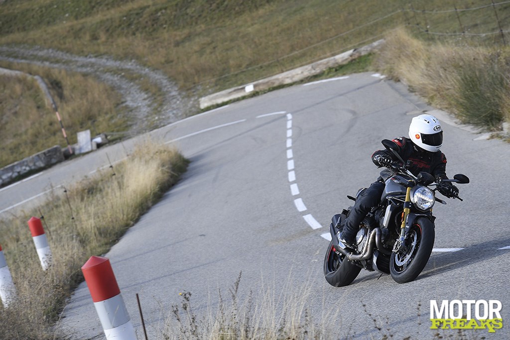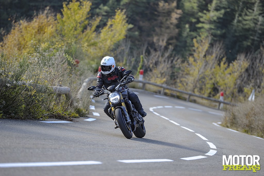 Veel belangrijker echter dan de verbeterde zit zijn de stuureigenschappen die er met sprongen op vooruit zijn gegaan. Over de deels nog natte wegen in Monaco voelt de Monster 1200 S in eerste instantie (met koude banden van het type Pirelli Diablo Rosso III) ietwat onwennig aan, maar nog geen tien minuten later voel ik me helemaal vertrouwd op de fiets en valt het me op hoe ontzettend gemakkelijk de Monster van richting te veranderen is. En niet alleen dat, hij doet dat ook nog met een precisie die ik niet had verwacht. In tegenstelling tot het huidige model doet de nieuwe Monster 1200 S precies wat van ‘m wordt verwacht en volgt mooi de ingezette lijn op. En dat is opmerkelijk, niet alleen omdat z’n voorganger duidelijk een neiging tot onderstuur had, maar bovendien omdat de krappe bergweg die Ducati voor ons heeft uitgezocht eigenlijk niet in het beeld van een dikke Naked Sport past. Eerlijk gezegd hadden we eerder een route met snelle, vloeiende bochten verwacht, maar dat was te gemakkelijk geweest. Hier op deze krappe bergpas komt de verbeterde wendbaarheid enorm tot z’n recht.