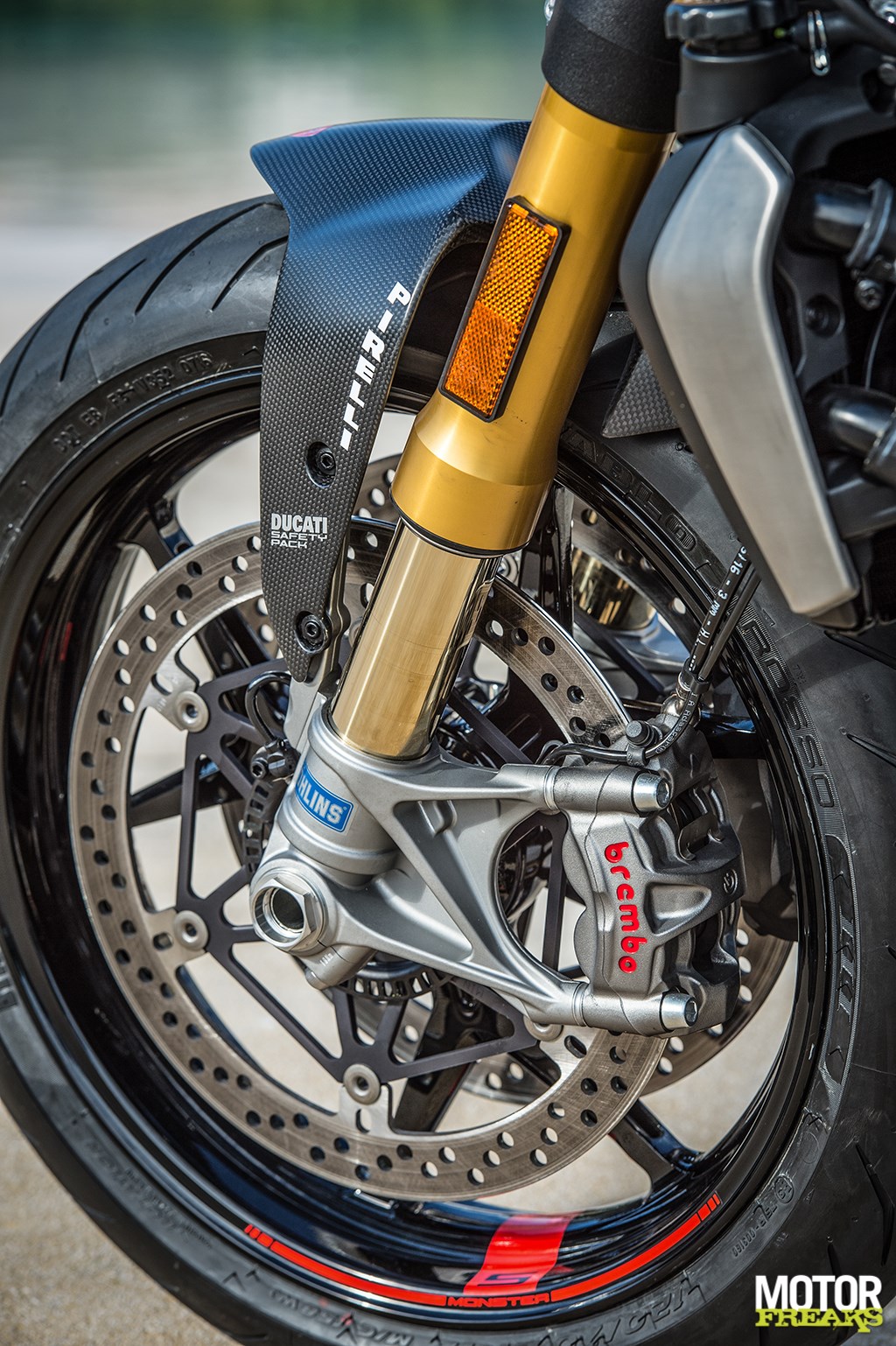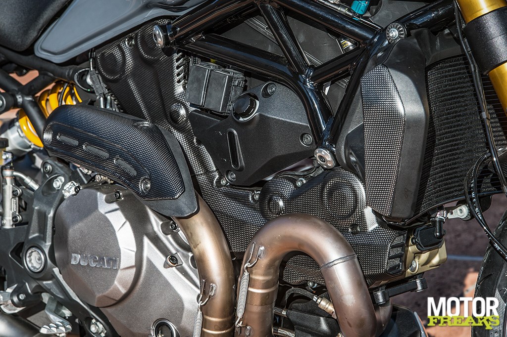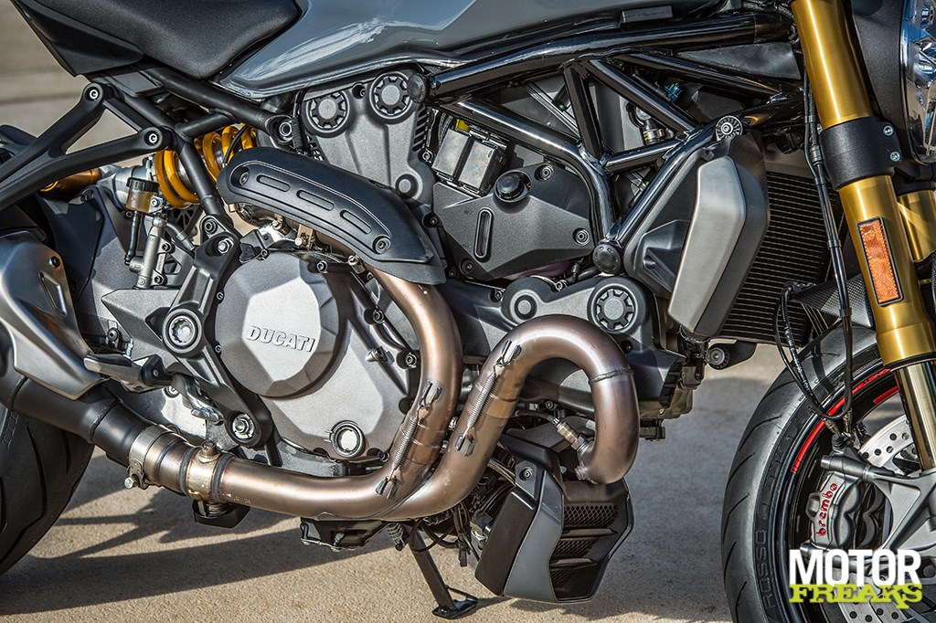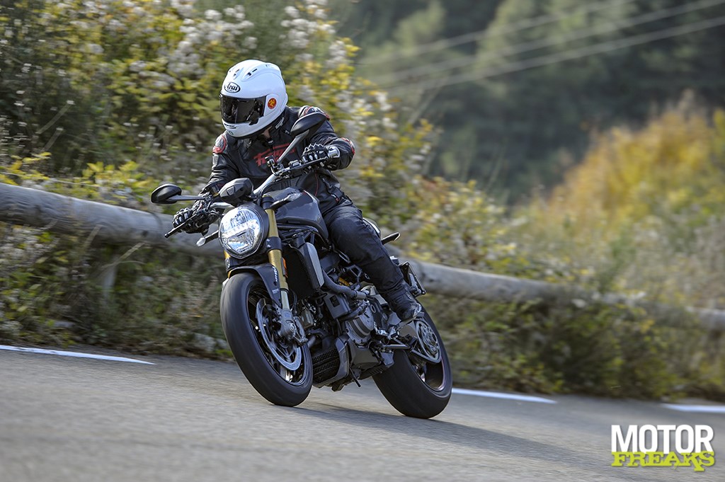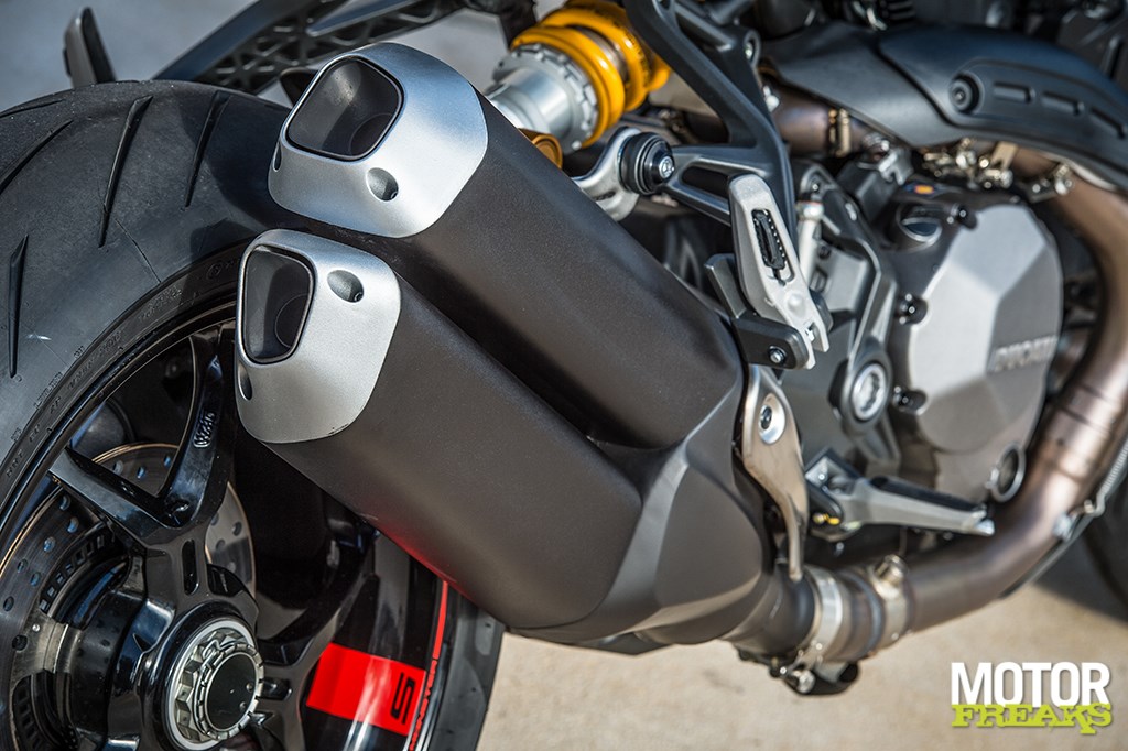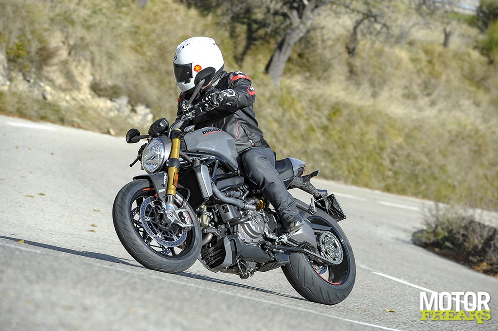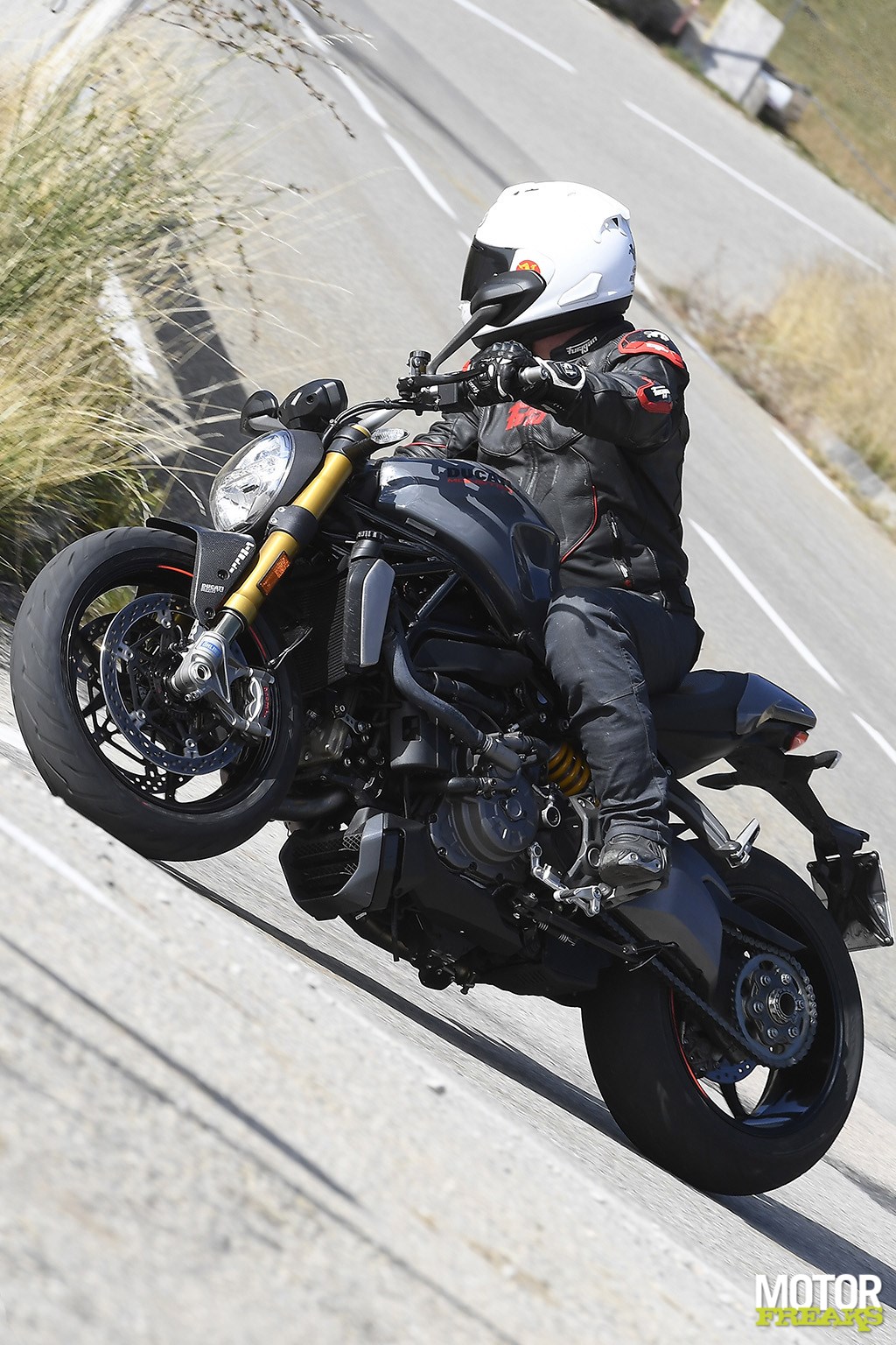 De stappen blijken precies groot genoeg om de verschillen goed te kunnen voelen. Wat remmen betreft grijpt het ABS duidelijk later in dan bij de Multistrada 1200 en is level 2 voor op straat eigenlijk al voldoende, waar we bij eerdere testen met de Multi het ABS het liefst hadden uitgezet. Ook wat wheelies betreft laat de Monster duidelijk meer toe: in Sportmodus gooit de Monster frivool het voorwiel in de lucht, terwijl in Touring modus de fiets zich nu haast als een MotoGP fiets gedraagt. Vol op het gas in tweede versnelling zweeft het voorwiel constant een centimeter of tien in de lucht, op een manier waar in het verleden alleen Aprilia’s APRC patent op had. Wel is het jammer dat de quickshifter met autoblipper functie voor terugschakelen zonder koppeling een eind aan die feestvreugde maakt. De bak schakelt weliswaar perfect op naar de volgende versnelling, maar de korte interruptie van de ontsteking is voldoende om het voorwiel weer terug op moeder aarde te brengen. Voor het opschakelen past de quickshifter de timing van de ontsteking en inspuiting aan, het terugschakelen gaat door een fractie van een seconde elektronisch tussengas te geven.