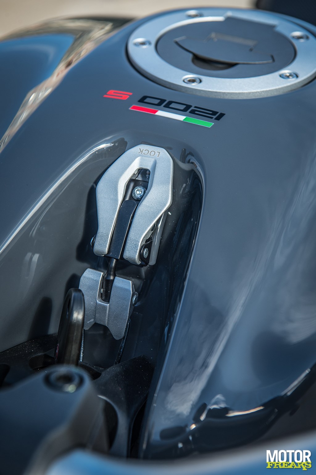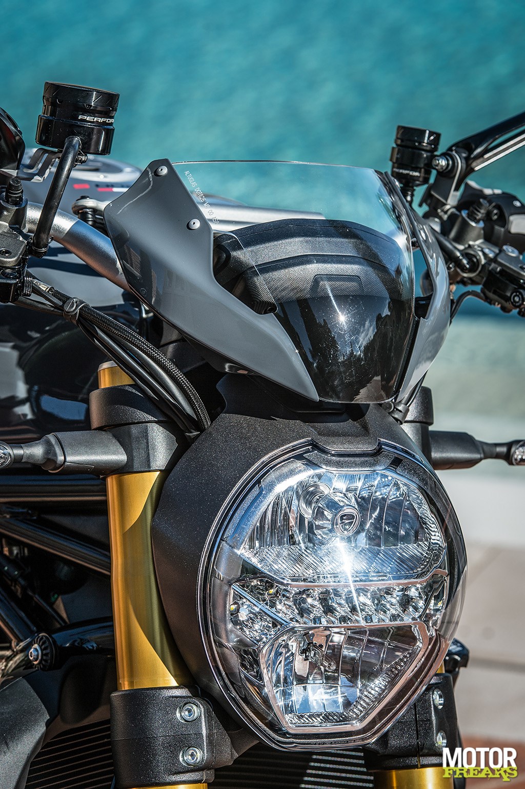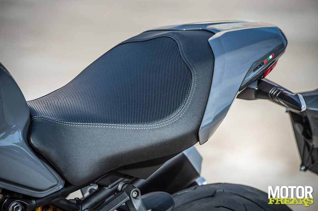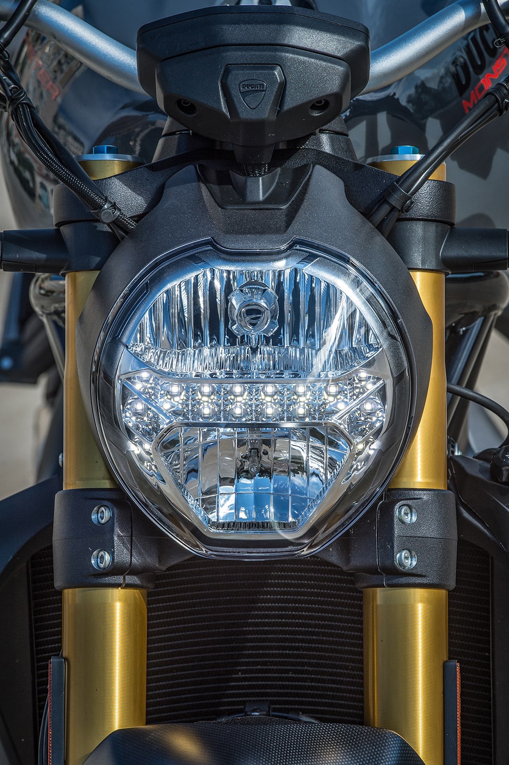 de nu 16,5 (was 17,5) liter tank is smaller uitgevoerd terwijl de enkele koplamp – een van de handelskenmerken van de Monster – nu met dubbele parabolen en LED dagrijverlichting is uitgevoerd. Als knipoog naar de oorspronkelijke Monster is de aluminium clip achter het contactslot weer terug van weggeweest en kan de tank weer omhoog worden gescharnierd. Bij de eerste Monster een must omdat de accu onder de tank was geplaatst, bij de 2017 Monster 1200 vooral handig in de Ducati werkplaats als het luchtfilter moet worden schoongemaakt.