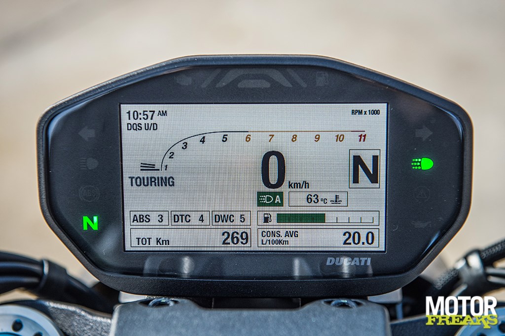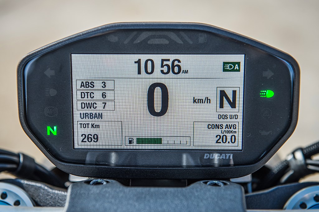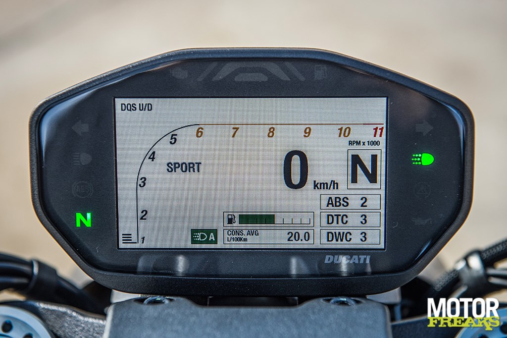 Vanaf het zadel heb je zicht op een prachtig vormgegeven TFT kleurenscherm waar een waslijst aan informatie afleesbaar is, maar daarmee was z’n voorganger ook al uitgerust. Wel nieuw zijn de nieuwe armaturen à la Multistrada 1200 aan het stuur, wat een enorme verbetering is ten opzichte de oude onhandige knopjes. Het enige wat ik echter niet begrijp is waarom Ducati voor de uniformiteit de armaturen een-op-een heeft overgenomen, maar qua indeling net weer wat anders heeft gemaakt. Dezelfde armaturen als de Multistrada 1200 was niet alleen logischer en goedkoper geweest, bovendien was de Monster dan al voorbereid op eventuele optionele cruise control. Door voor andere knoppen te kiezen zit dat er nu niet in,