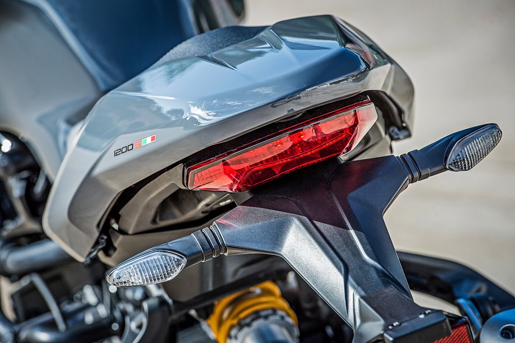Niet alleen wat geometrie, maar ook wat design betreft is Ducati weer terug naar het oorspronkelijke design van Galluzzi gegaan. De aan de achterbrug gemonteerde kentekenplaathouder die je het zicht op de vette achterband ontneemt heeft plaats gemaakt voor een fraai aan het kontje geschroefd exemplaar (wat bij de huidige Monster 1200 trouwens als accessoire kon worden aangepast),