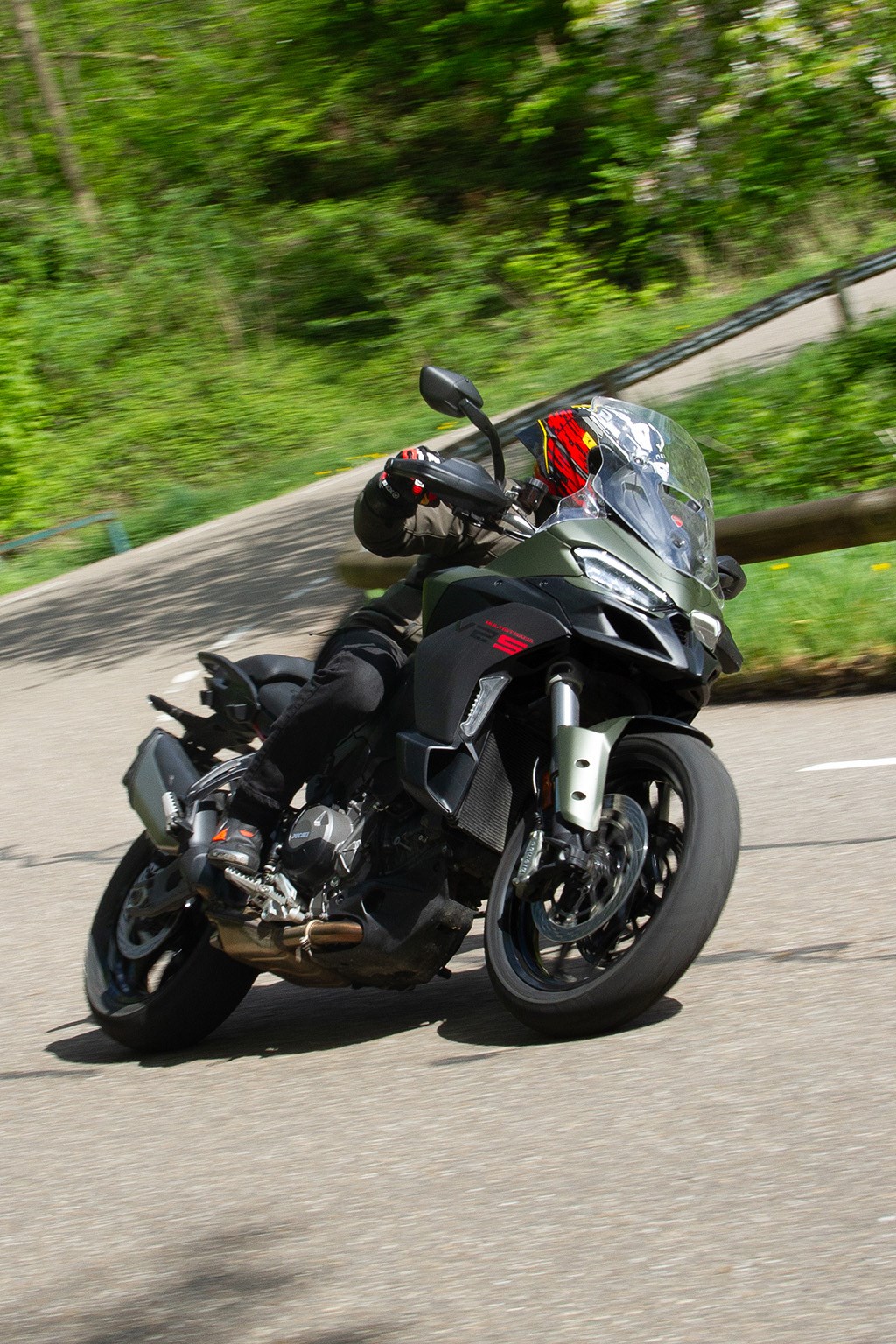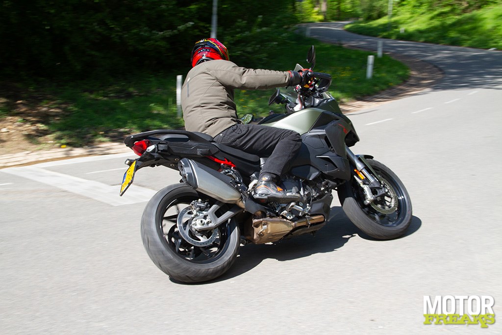 Ducati V2 S stuurt. En hoe ontzettend verkeerd ik de motor op voorhand had ingeschat. Slechts de kleinste input is nodig om de motor van koers te laten veranderen, zonder dat ’ie nerveus aanvoelt, met speels gemak is de motor op elke lijn te leggen die jij maar wilt. Dat de motor daarbij zeer koersvast is en mooi z’n lijn vasthoudt wil trouwens niet zeggen dat die lijn niet eenvoudig kan worden aangepast indien dat nodig is, want ook dat is kinderspel, net als het remmen tot diep in de bocht. In een woord: chapeau!