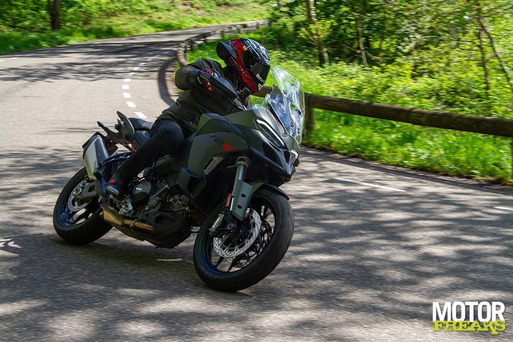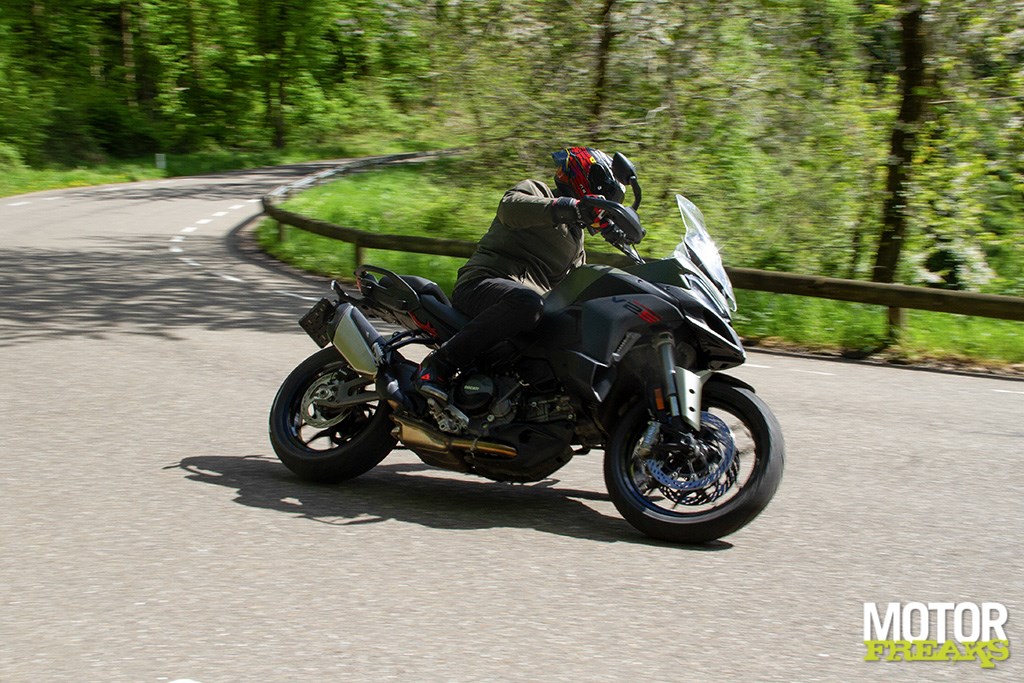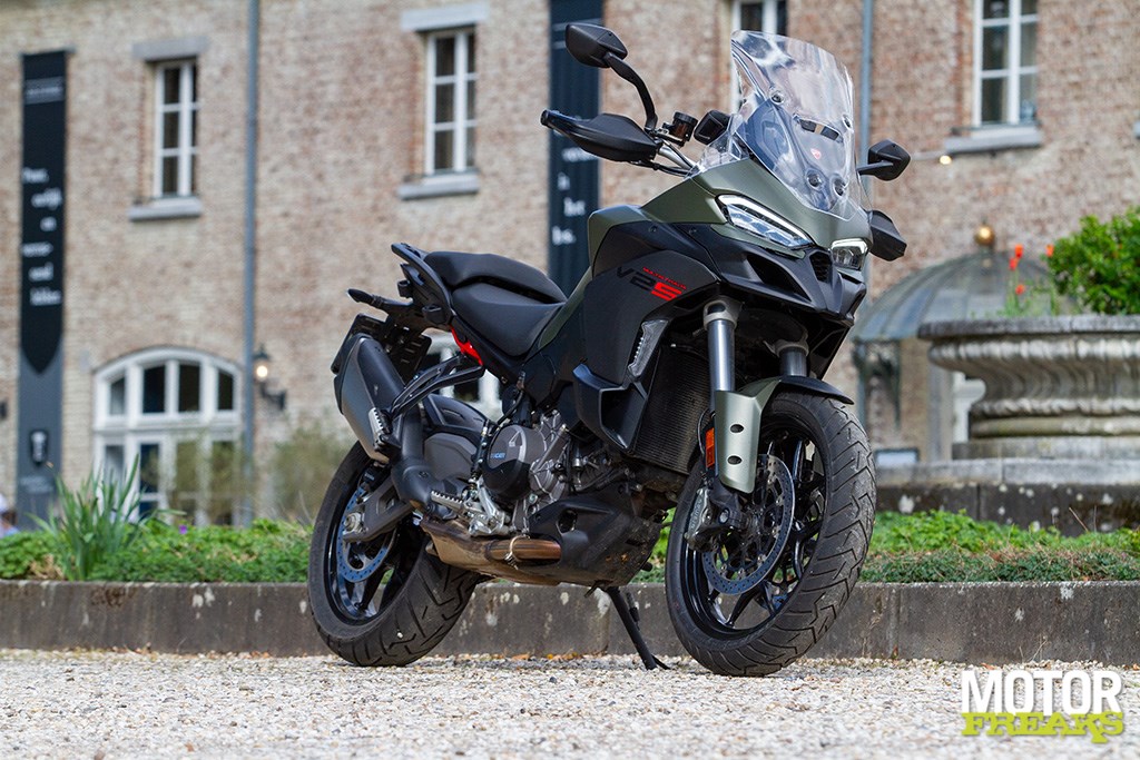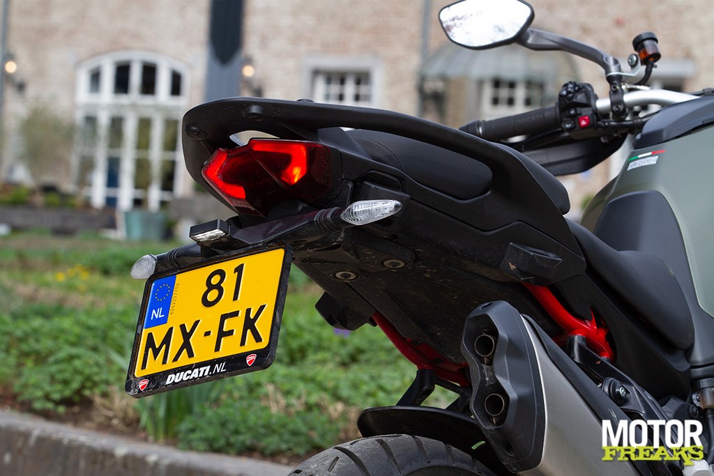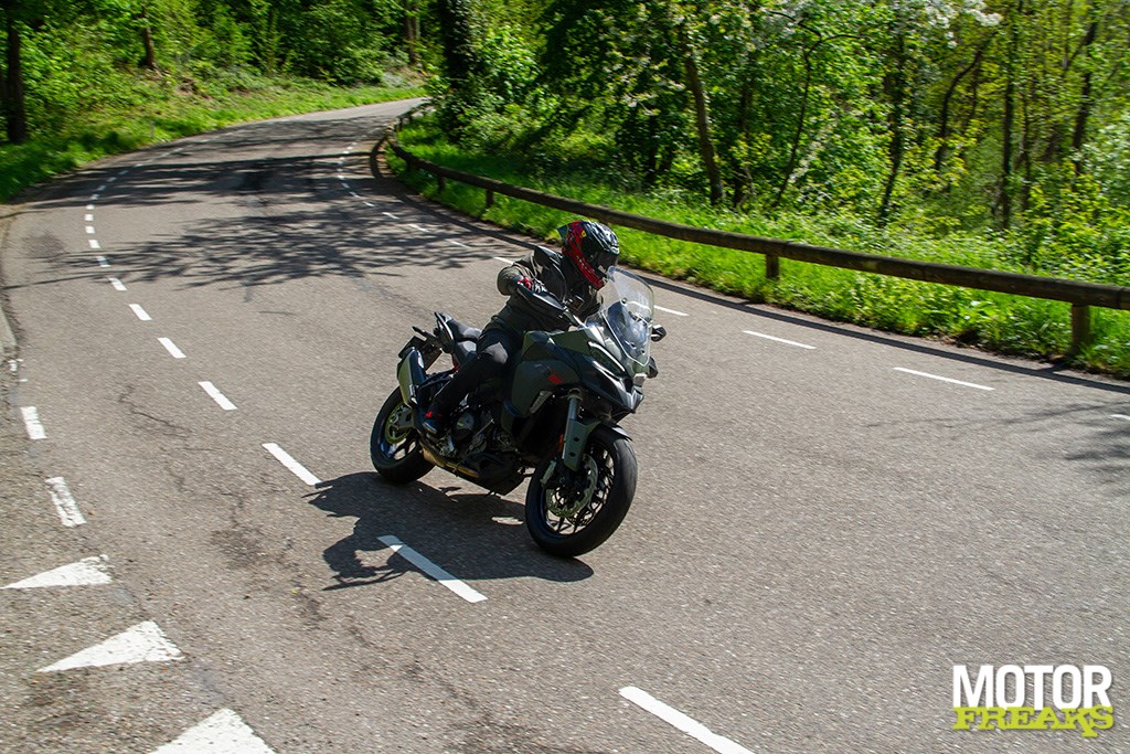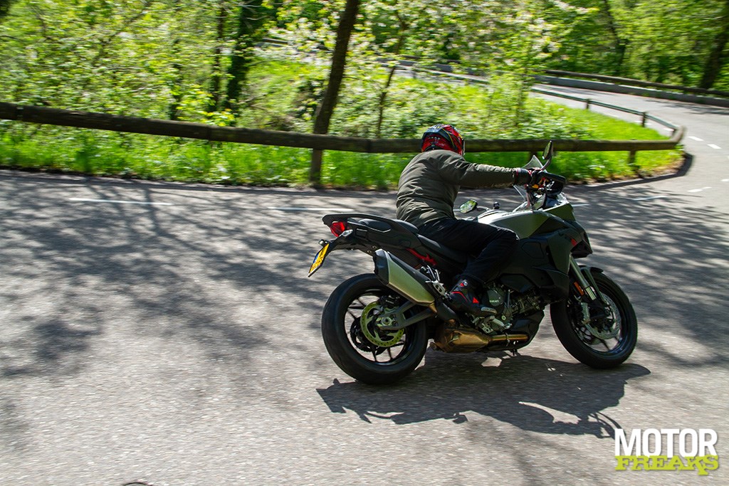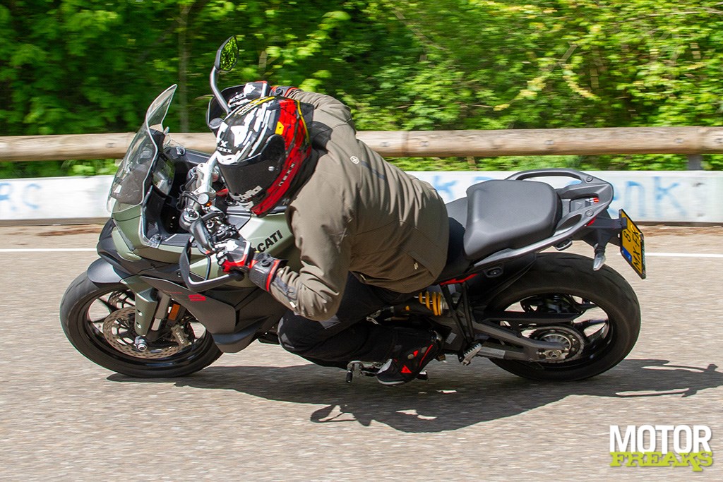 Ook zijn we zeer te spreken van de Marzocchi semi-actieve vering. Hoewel de vering los van de rijmodus aan te passen is hebben we geen enkele behoefte dat ook daadwerkelijk te doen, zo goed als de gekozen setting van elke rijmodus is. In de rijmodus Sport heb je dus niet alleen de meest directe gasrespons, maar ook de meest sportieve setting van de Skyhook vering. Van Sport naar Road voelt de vering hoewel nog steeds sportief wat zachter aan, terwijl in de Rain modus comfort de allerhoogste prioriteit heeft gehad. Mijn persoonlijke voorkeur blijft naar de Sport-modus uitgaan, maar ook de andere rijmodi zijn prima voor elkaar en dat is in het verleden bij Ducati wel eens anders geweest. Ook hier dus een dikke driewerf hoera. Het enige dat we misschien beter hadden verwacht is z’n verbruik, dat met een gemiddelde waarde van 1 op 20 (5 liter voor onze zuiderburen) op zich zeker niet slecht is, maar wel hoger ligt dan de eveneens 115 pk sterke Triumph Tiger Sport 800 waarmee we vlak daarvoor op pad waren geweest en op dezelfde liter E10 gemiddeld 3 kilometer verder kwam.
