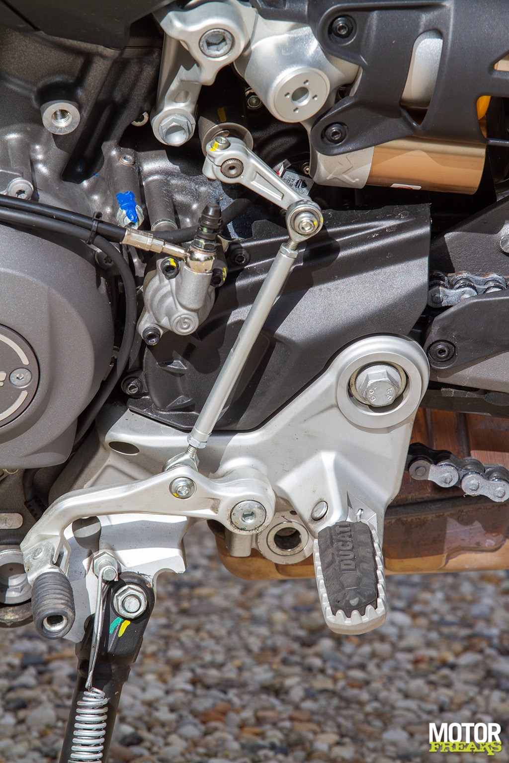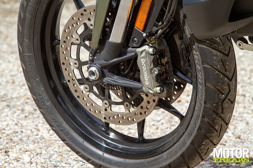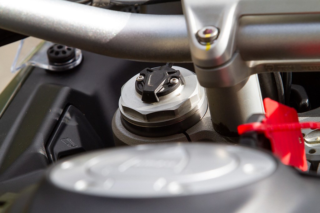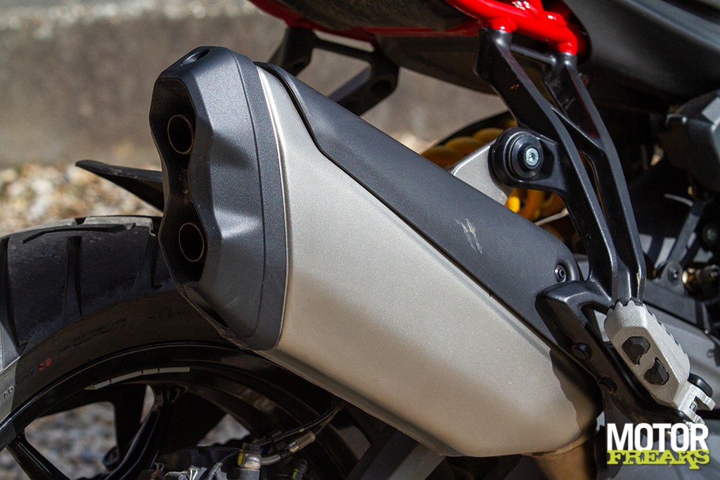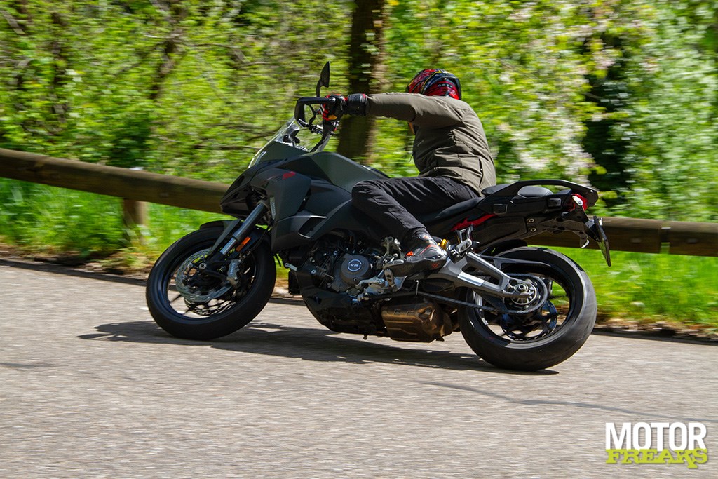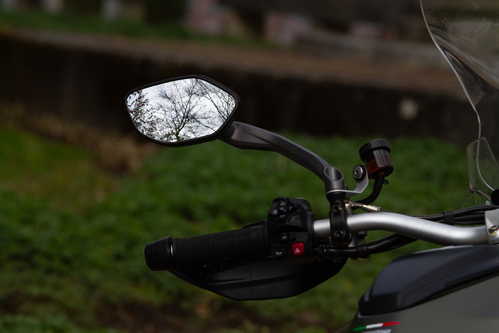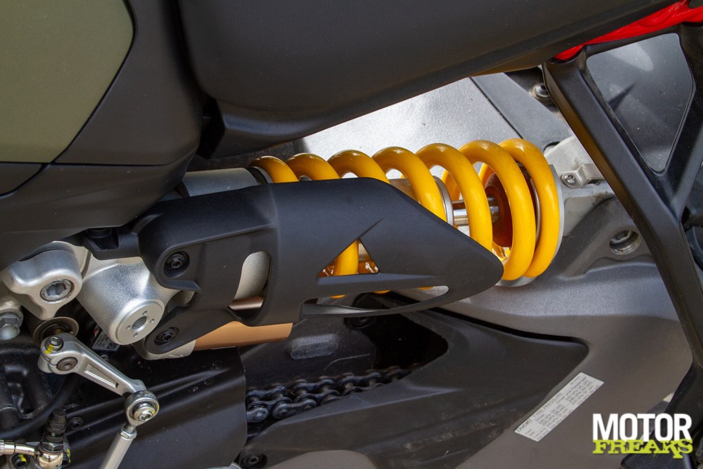 Ook zijn we zeer te spreken van de Marzocchi semi-actieve vering. Hoewel de vering los van de rijmodus aan te passen is hebben we geen enkele behoefte dat ook daadwerkelijk te doen, zo goed als de gekozen setting van elke rijmodus is. In de rijmodus Sport heb je dus niet alleen de meest directe gasrespons, maar ook de meest sportieve setting van de Skyhook vering. Van Sport naar Road voelt de vering hoewel nog steeds sportief wat zachter aan, terwijl in de Rain modus comfort de allerhoogste prioriteit heeft gehad. Mijn persoonlijke voorkeur blijft naar de Sport-modus uitgaan, maar ook de andere rijmodi zijn prima voor elkaar en dat is in het verleden bij Ducati wel eens anders geweest. Ook hier dus een dikke driewerf hoera. Het enige dat we misschien beter hadden verwacht is z’n verbruik, dat met een gemiddelde waarde van 1 op 20 (5 liter voor onze zuiderburen) op zich zeker niet slecht is, maar wel hoger ligt dan de eveneens 115 pk sterke Triumph Tiger Sport 800 waarmee we vlak daarvoor op pad waren geweest en op dezelfde liter E10 gemiddeld 3 kilometer verder kwam.