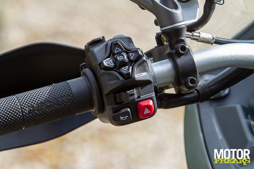 Waarmee we bij een van de belangrijkste verbeterpunten zijn gekomen: de bediening van het 5” TFT-display. Niet alleen heeft Ducati nu eindelijk het licht gezien en op het stuur een aparte knop voor de rijmodus geïmplementeerd, waardoor met een druk op de knop de rijmodus kan worden aangepast (inderdaad, zoals BMW dat al sinds jaar en dag doet), daarnaast is Ducati op het ‘vier-knoppen’ concept overgestapt waardoor het nu kinderspel is om door het scherm te navigeren en zaken aan te passen. Eindelijk! Wel is het jammer dat de schakelaars geen verlichte omranding hebben, wat schakelaars in het donker stukken gebruiksvriendelijker maakt, maar da’s dan voor de volgende. Met de nieuwe knoppen ben ik al superblij,eindelijk van die stomme ellende verlost van knoppen die vanwege hun dubbele functie ineens iets anders doen dan de bedoeling was (zoals bijvoorbeeld de dagteller