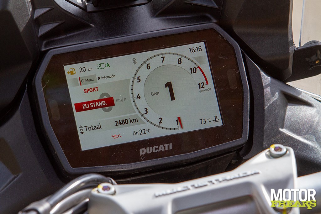 Ook het 5” TFT-kleurendisplay is aanzienlijk verbeterd en kent nu drie verschillende lay-outs, waardoor het gek moet gaan wil er niets van je goesting tussen zitten. Uiteraard heeft het display Bluetooth connectiviteit, maar hoe we het ook proberen, we slagen d’r maar niet in om via de Ducati-app verbinding te maken. Terug in Zaltbommel komt Ronald me al lachend tegemoet. “Ik wil je niet plagen, maar jij hebt een iPhone zeker”, vraagt hij aan mij. “De reden dat ik dat vraag is omdat 9 van de 10 keer het een iPhone is die geen verbinding krijgt.” Om die stelling luister bij te zetten pakt hij zijn eigen Android telefoon, die in tegenstelling tot de Multistrada V2 wél meteen in mijn Bluetooth lijst verschijnt, en maakt probleemloos verbinding met de Multistrada V2. Gezien het feit dat dit nu in korte tijd de derde fiets is waarbij het connecten ontzettend moeizaam gaat (maar wel de eerste waarbij het helemaal niet lukt) en het feit dat het Ronald met de Android telefoon wel meteen lukt lijkt het me inderdaad meer een iPhone- dan een Ducati-dingetje te zijn. En omdat ‘onze’ Multistrada V2 S niet van de optionele turn-by-turn navigatie is voorzien onderneem ik thuis geen verdere pogingen meer om de motor met mijn iPhone te verbinden. Dan maar niet.