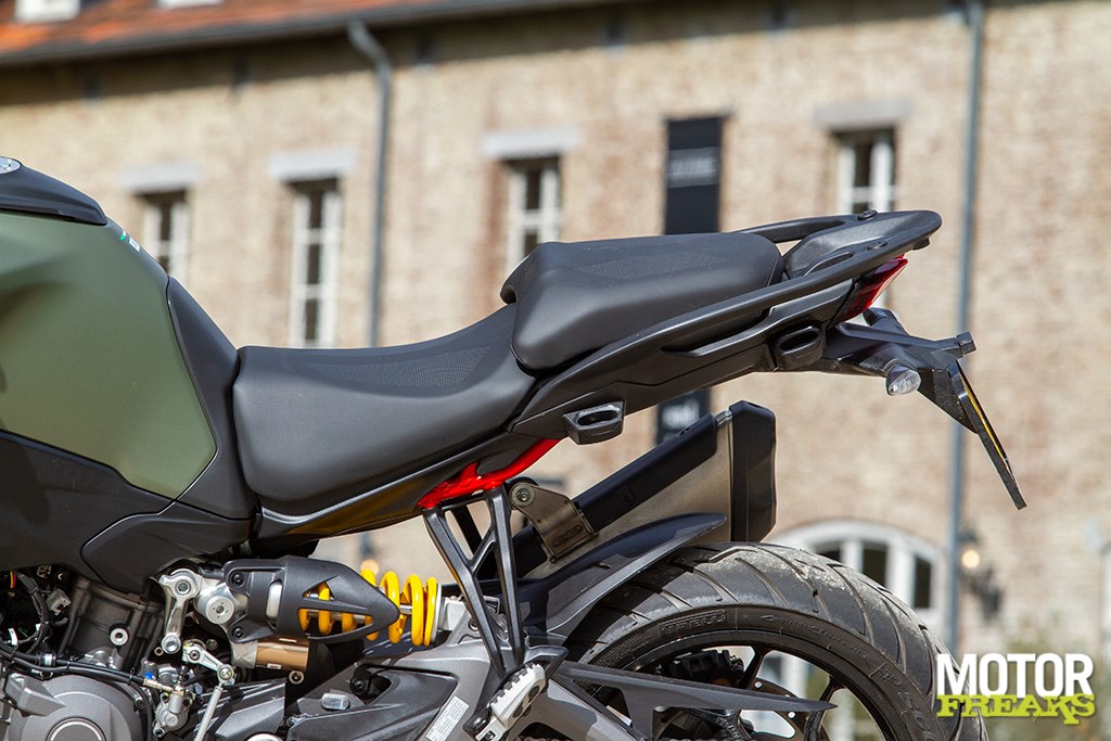 Volgens Ducati is 'ie smaller bij de flanken, zodat je makkelijker je voeten aan de grond krijgt. Zithouding is niets op aan te merken