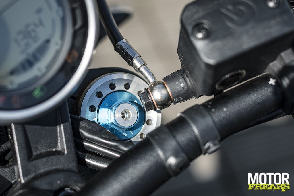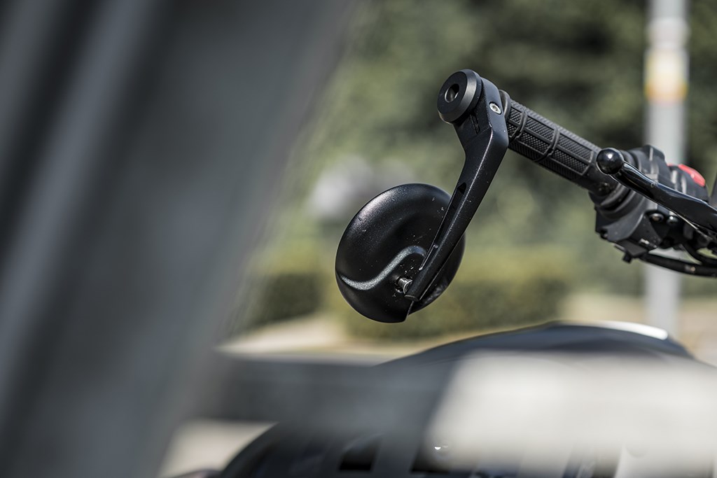 Het display is echter nagenoeg het enige smetje op het blazoen van deze Scrambler 1100 Sport EVO. Nagenoeg, want een ander puntje van kritiek zijn de bar-end spiegels. Volgens Ducati kun je ze zowel ‘onderhands’ als ‘bovenhands’ monteren en qua coolheidsfactor brengen ze minstens 10 op de schaal van 10, maar naar beneden gemonteerd zie je d’r echt geen ene moer in en daarnaast is de stelmogelijkheid redelijk beperkt. Voor we ’t in de gaten hadden was met stellen de spiegelbeugel dan ook losgeraakt, maar door ‘m tegen de richting in te draaien kregen we ‘m gelukkig wel weer vastgezet zonder op zoek naar een kruiskopschroevendraaier te hoeven gaan. Dat scheelde een slok op een borrel en bovendien, als ’t je eigen motor is het afstellen van de spiegels iets eenmaligs wat je thuis prima kunt doen.