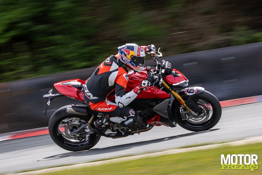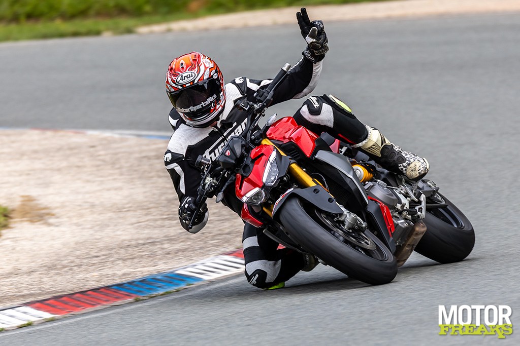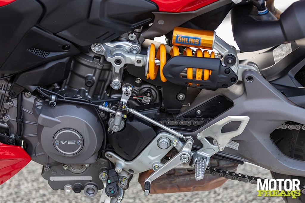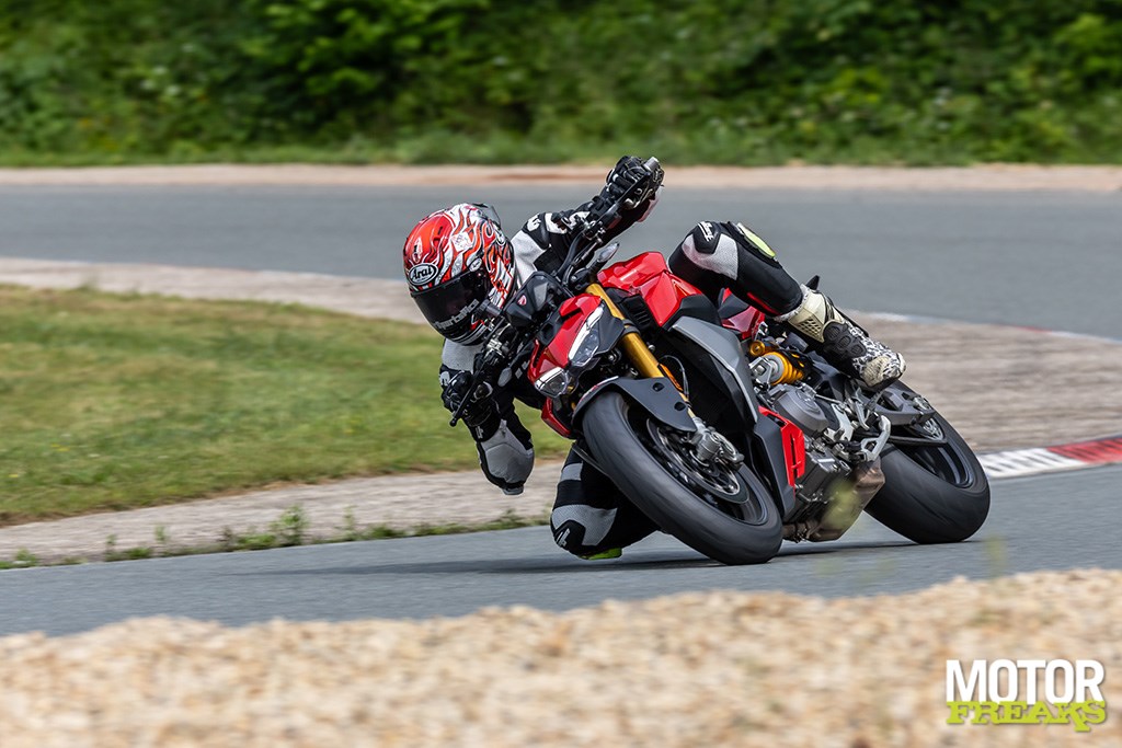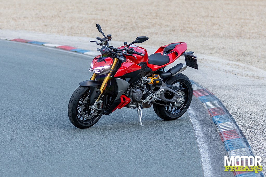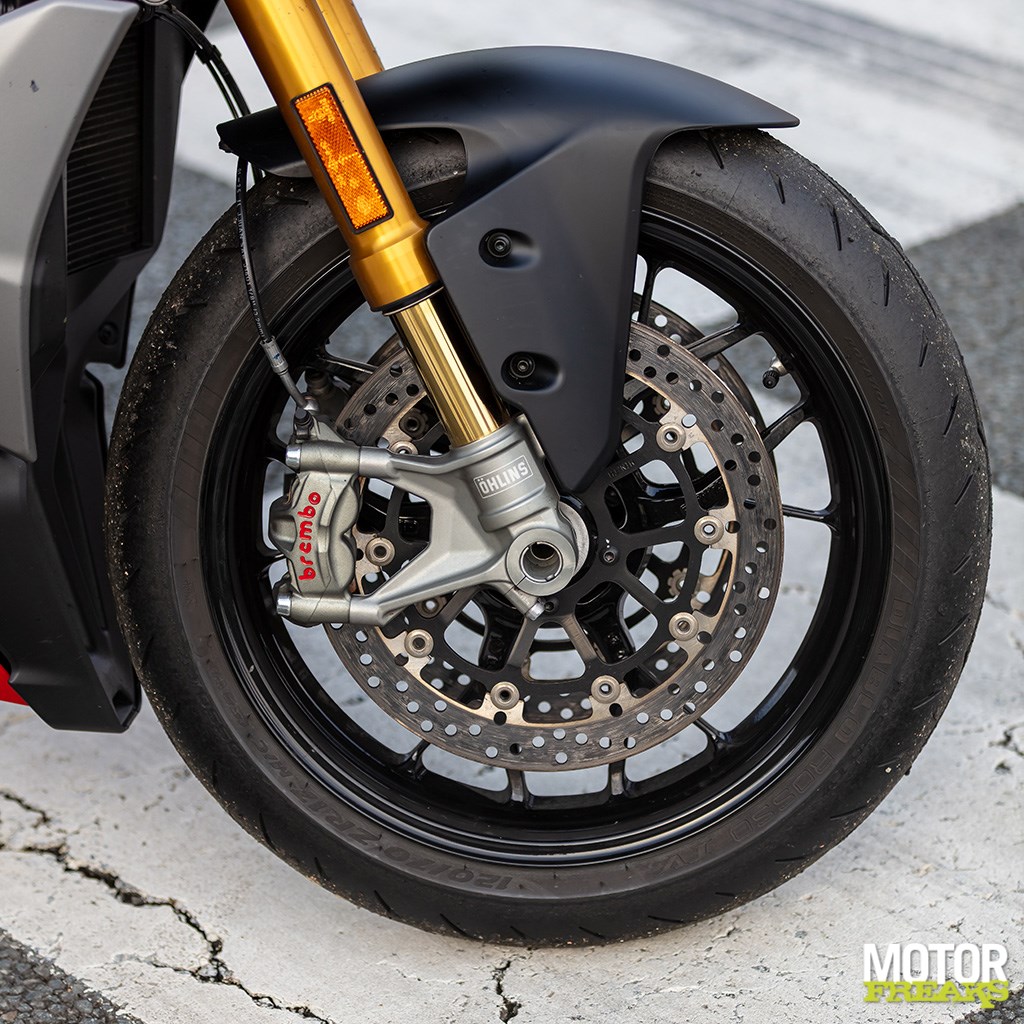 En dan het rijgedrag. De Streetfighter V2 S is écht lichtvoetig. De nieuwe lichtere constructie (dan de oude 955) maakt dat je hem bijna door de bocht stuurt puur en alleen door met je oogballen te rollen. De dubbelzijdige swingarm, voor het eerst op een kleine Streetfighter, doet z’n werk uitstekend en draagt bij aan die stabiliteit en rust. De langere wielbasis helpt hier ook: 30 mm erbij zorgt voor meer vertrouwen. De Öhlins NIX30 voorvork en TTX36 achtershock ken je vast al van de Panigale’s en andere snelle jongens, en ze doen hier gewoon weer wat ze moeten doen: strak, voorspelbaar en met genoeg marge zelfs voor de geoefende circuitrijder.
