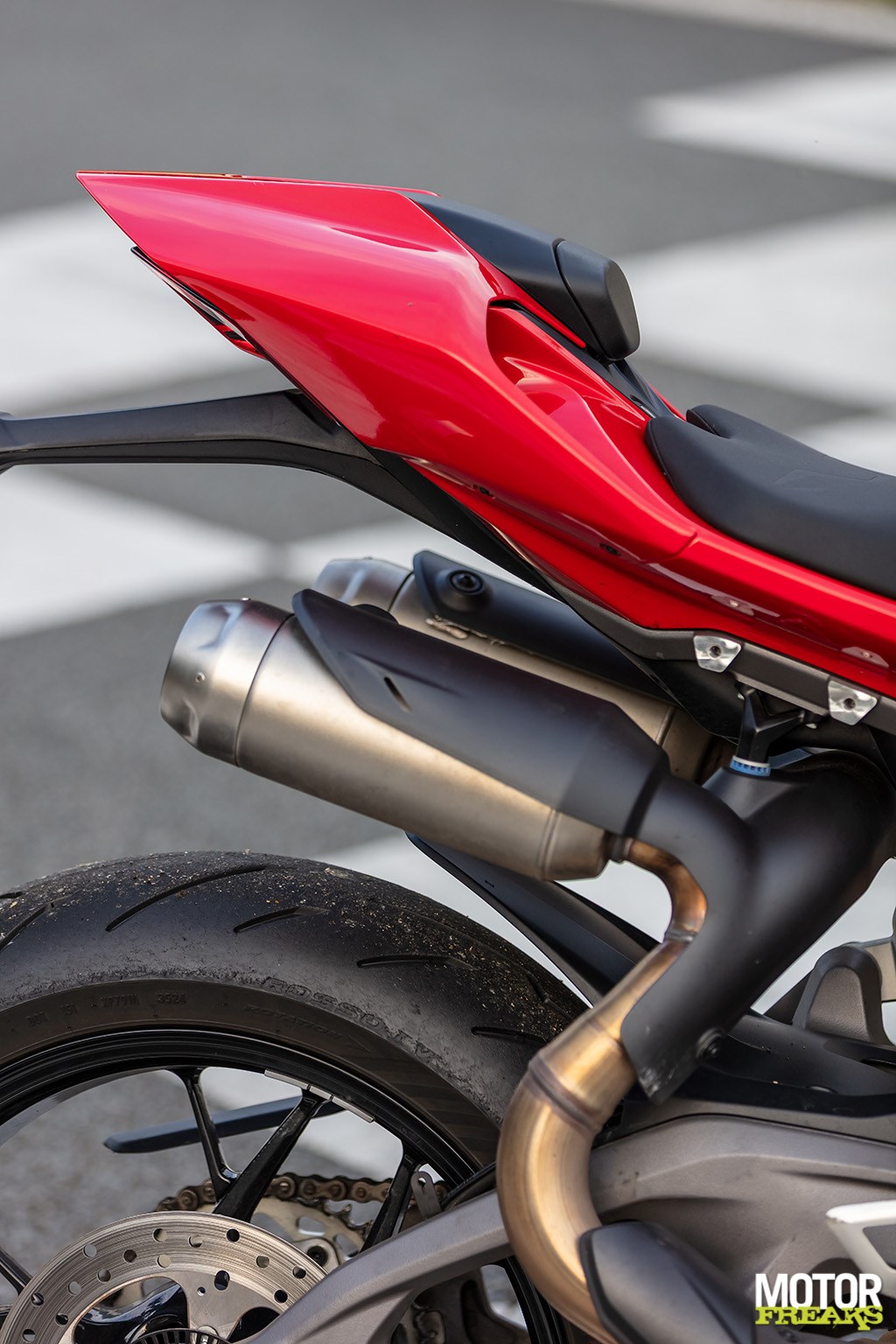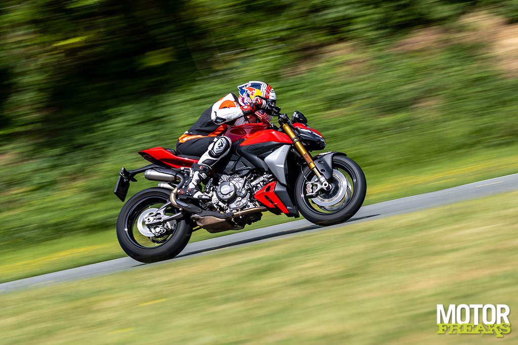 Eenmaal in de remzone valt op hoe weinig motorrem het blok heeft, maar stevig vertragen is dankzij de dubbele 320 mm Brembo remschijven compleet met Brembo M50 remklauwen en een radiale rempomp uiteraard geen probleem. De motor laat zich daarbij probleemloos onder hellingshoek richting apex vertragen zonder daarbij noemenswaardig op te richten waardoor je dus prima hard en plat kunt insturen. Versnellingswisselingen verlopen snel en probleemloos dankzij de quickshifter (up en down) waarbij gebruik