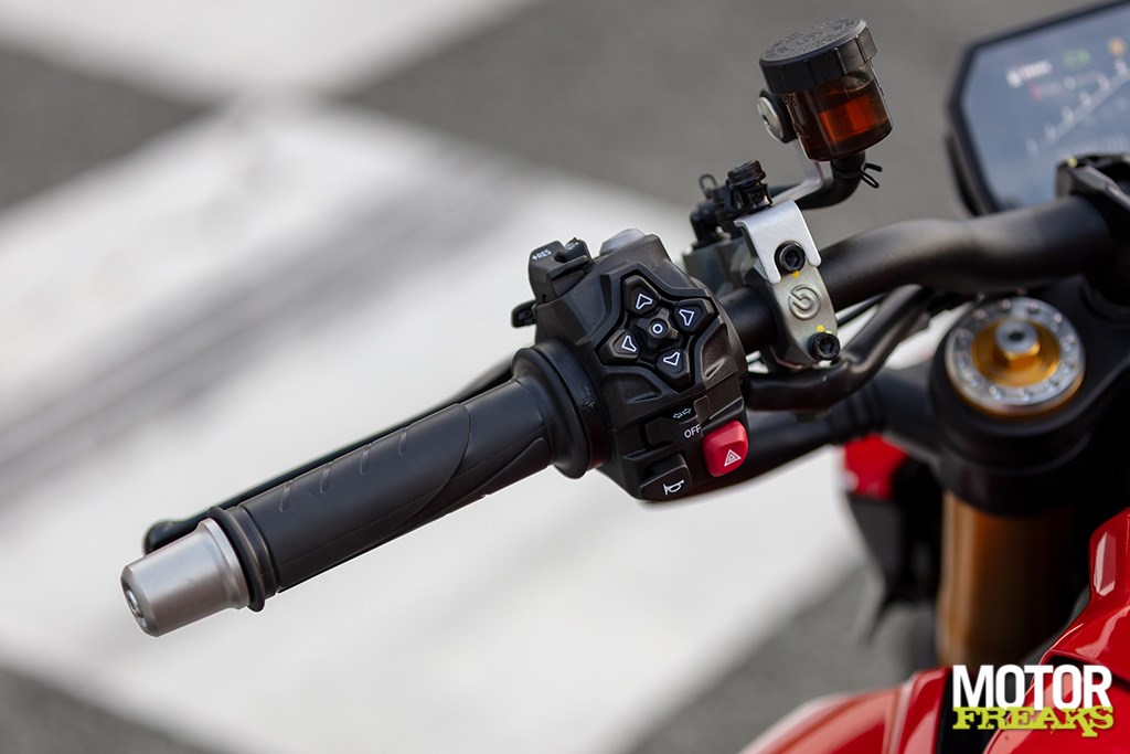 Op het gebied van elektronica doet Ducati niet moeilijk. Vier rijmodi (Wet, Road, Sport en Race), drie vermogensstanden, bochten-ABS, tractiecontrole, wheeliecontrole, motorremregeling, en uiteraard een quickshifter. Launch control en pitlane limiter krijg je alleen standaard op de V2 S, als je de standaard V2 hebt moet je die indien gewenst bijbestellen. Nu kunnen we dat nog wel begrijpen, per slot van rekening moet er onderscheid zijn tussen de standaardversie en de S, maar waar we met onze pet echt niet bij kunnen is het feit dat iets essentieels als cruisecontrole zelfs op de S-versie niet standaard is voorzien, evenals navigatie, een USB-poort en bandenspanningscontrole. Voor deze gadgets zul je toch echt de accessoire catalogus moeten raadplegen, beetje jammer is dit wel gezien de prijsklasse waarin we zitten.
