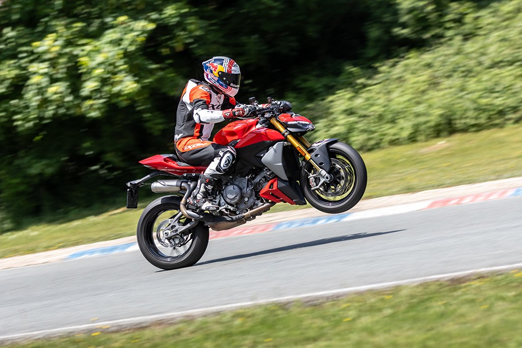 Waar de vorige generatie Streetfighter nogal eens werd vervloekt vanwege het bakken-onder-je-kont-gevoel, heeft Ducati bij de nieuwe V2 echt werk gemaakt van de koeling. Zelfs met flink op circuit door raggen en zomerse buitentemperaturen blijft het acceptabel – voor Ducati-begrippen dan. De zithouding is verbeterd dankzij een 30 mm breder stuur, wat de controle in bochten en bij stevig remmen ten goede komt. Je zit lekker "in" de motor, met genoeg ruimte om je kont te verzetten.