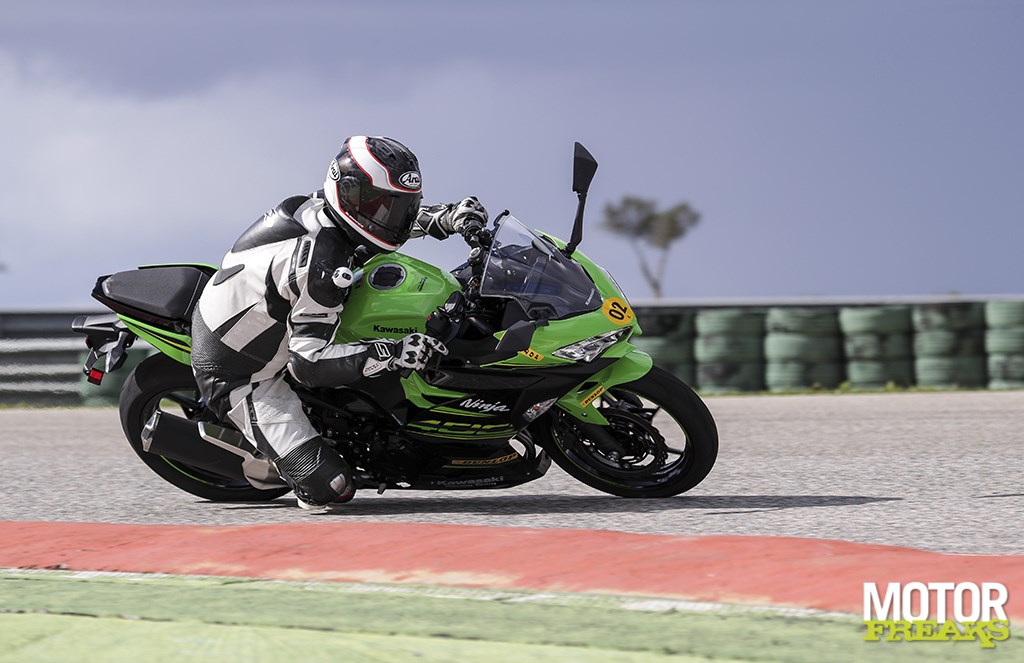 Toch is het niet alleen een band voor de supersports, wat Dunlop met het inzetten van roadsters en de kleine Ninja’s wil onderstrepen. Het is ook gewoon een heel goede straatband, die heel toevallig ook inzetbaar is op het circuit. Het gebeurt bij ons lang niet zo veel als in zuidelijke landen, zo weten ze ons te vertellen, maar het schijnt dus best normaal te zijn om met je RS of NineT af en toe een sessie of dagje mee te pakken. En al snappen we nu achteraf wel waarom, als je het combineert met een paar echte superbikes heb je nog een flinke kluif. Maar de wetenschap dat dezelfde band die een woeste 200 pk in het gareel houdt, ook gewoon werkt op de 45 pk die de Ninja, maakt het interessant. En dan hadden we het tot nu toe alleen nog maar over de grip op een droge baan, waar de banden