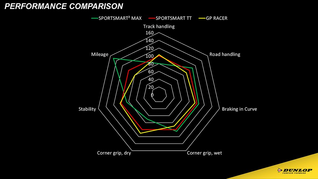 Is het daarmee meteen de ultieme band voor zowel op de weg als op het circuit? Niet noodzakelijk, want je kunt niet zomaar alles tegelijk verbeteren, je zult compromissen moeten maken. Eenvoudig gezegd: meer grip is vaak evenveel minder levensduur en meer stabiliteit is minder flitsend sturen. Dat is Dunlop zich ook sterk bewust en geeft daarbij toe dat sommige van die compromissen heel duidelijk gemaakt zijn. De Sportsmart TT is dus nooit gemaakt om het langst van allen mee te gaan, dan heb je veel meer aan de