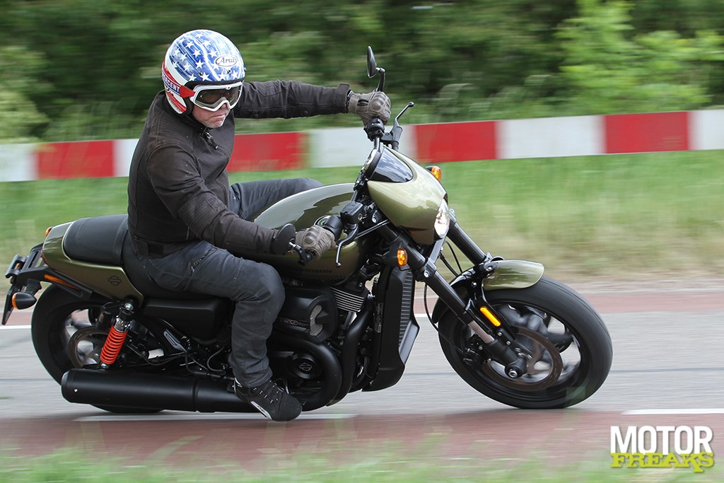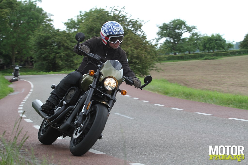 “Wie in hemelsnaam heeft bedacht dat je zó op een motor moet zitten,” is het eerste dat in me opkomt zodra ik me op de Street Rod bij Harley-Davidson in Veghel heb genesteld. Direct gevolgd door een “en welke zot heeft dat goedgekeurd?” Nog maar amper het industriegebied verlaten en koers richting Maaskantje gezet voel ik me als een reumapatiënt die op yoga is gezet. Alsof je op een verlaagd toilet aan het poepen bent, zo laat zich de zit nog het best omschrijven. Het is met name de positie van de voetsteunen die in een zeer onnatuurlijke zit heeft geresulteerd. Het lage zadel en het heerlijk brede stuur, dat binnen handbereik zit, zorgen voor een ontspannen maar wel ‘klaar voor de aanval’ sprinter-zit, en met een set forward controls was het waarschijnlijk ook helemaal af geweest. Alleen zou ’t dan een cruiser zijn geweest en dat is wat Harley nou net niet wilde met de Street Rod. En dus zitten de voetsteunen waar je ze zou verwachten bij een (semi)sportieve naked, wat helemaal prima was geweest als ze de zadelhoogte zo rond de 800-815 mm hadden gezet. Alsof dat niet erg genoeg zat er ook nog een uitlaatsysteem in de weg, waardoor de rechtersteun wat hoger is gemonteerd.