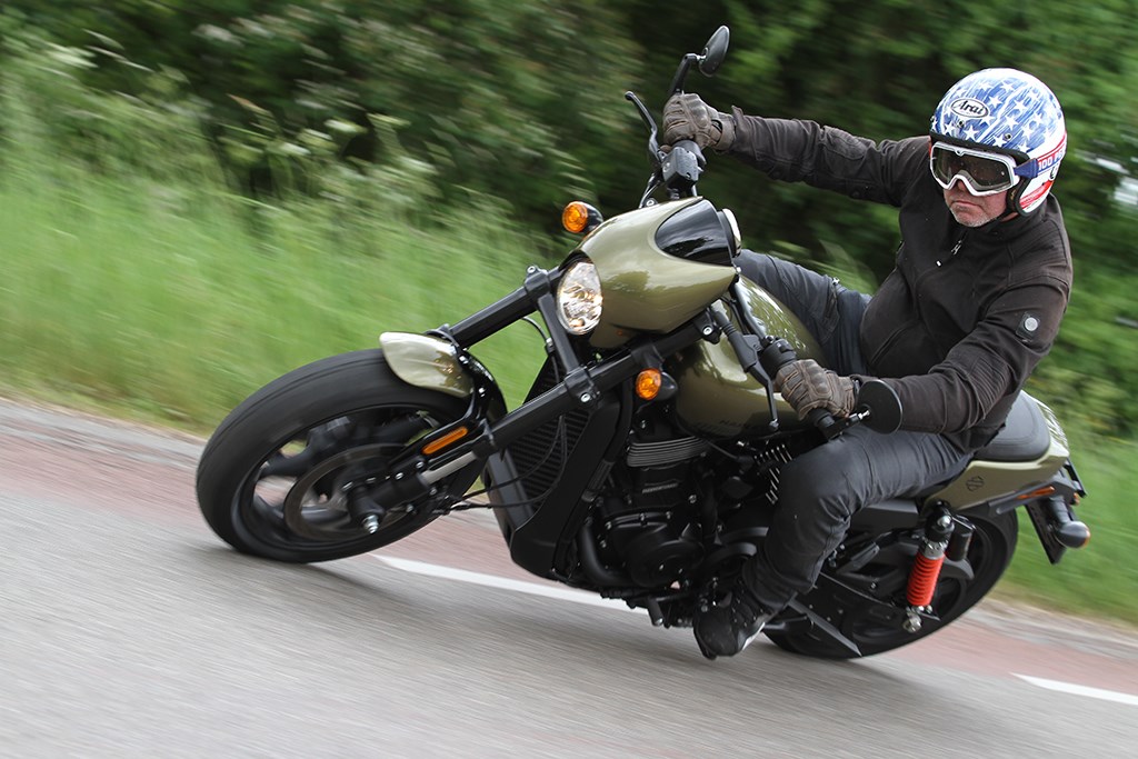 Als niet veel later de eerste van veel rotondes zich aandoet ben ik zelfs aangenaam verrast met het gemak waarmee de dubbele chicane, excuus… rotonde kan worden genomen. Licht en neutraal en geeft daarbij zoveel vertrouwen dat nog voor het weer rechtuit gaat beide voetsteunen al over het asfalt hebben geschraapt. De 749 cc V-Twin heeft weliswaar niet die enorme klappen van onderuit waar Harley al sinds mensenheugenis om wordt geroemd, maar voor een middenklasse naked gaat de Street Rod toch behoorlijk van z’n plek.