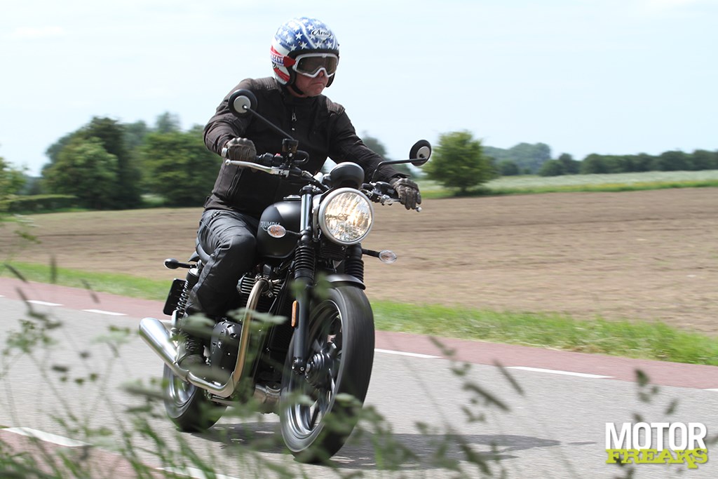Dat Burger zo lovend was over de Street Twin begrijp ik best. Vanaf de Rod voelt de zit van de Twin als een Chesterfield, het blok loopt fluweelzacht, trillingsvrij en is in vijfde versnelling tot bijna stationair af te knijpen, en ook het rijwielgedeelte doet z’n werk perfect. De fiets geeft geen klap verkeerd, maar dat is ook meteen z’n manco: hij geeft geen klap verkeerd en weet daardoor geen gevoelige snaar te raken. Beetje het Hondasyndroom, perfect tot in het detail maar zonder een spatje van emotie. In het tempo dat Vincent er nog steeds op de Streed Rod op nahoudt – hoezo niet vooruit te branden – is de enkele schijf in het voorwiel aan de lichte kant, maar wie de Street Twin normaal gebruikt zal ’t waarschijnlijk geeneens opvallen. Net als dat we al weer zijn vergeten dat dit de 35 kW versie is. Hadden ze ’t ons niet gezegd bij Triumph, dan was ’t waarschijnlijk nog geeneens opgevallen, zo goed als de Street Twin het – even los van de Street Rod – in feite doet. En dat is alleen maar een compliment aan de fiets en een goed verkoopargument richting de beginnend motorrijder, waar Triumph z’n pijlen met de Street Twin op heeft gericht.