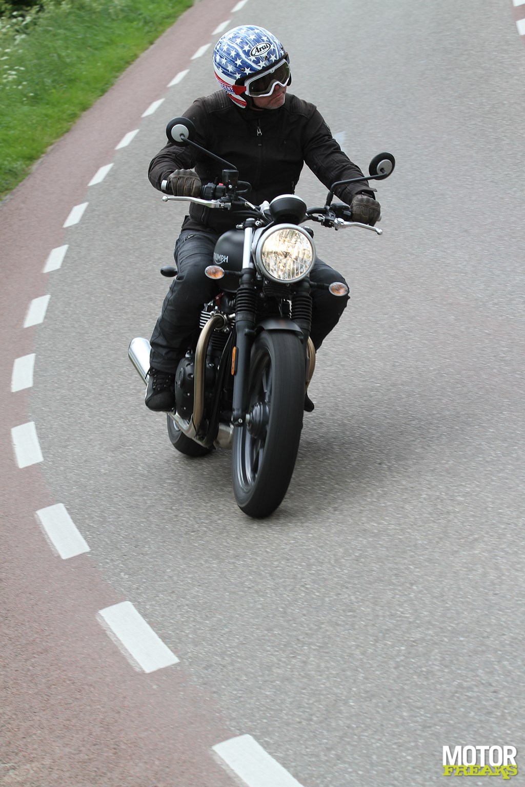 Want stap op de Street Twin en je onthaast per direct. Of nou ja, dat hoeft niet, want het ding is nog rap zat, maar alleen het zitten al is van een totaal ander kaliber. Heerlijk luchtig, moeiteloos, voor de hand liggend, relaxed. Start ‘m en de paralleltwin ploft er lekker op los, geef meer gas en je voelt de verbrandingsslagen je supersmeuïg voortstuwen. Kan best zijn dat volgens Ed dit minder leeft dan een Kawasaki W800 in zijn beleving, maar die Kawa is er sowieso al niet eens meer. Exit. Jammer joh. De Triumph doet gewoon wat ‘ie doet en dat doet ‘ie goed. En dat is eigenlijk al alles, want zoals gezegd trekt de Easy Rider alle aandacht. Dáár raak je niet over uitgepraat. Dit ding wel en vooral in het bijzijn van z’n kameraad. Maar of dat erg is? Niet in het minst. Ik ging net even voor een boodschapje in de stad en pakte de Triumph. Geen zin in poespas, de motor ook niet, klare zaak.