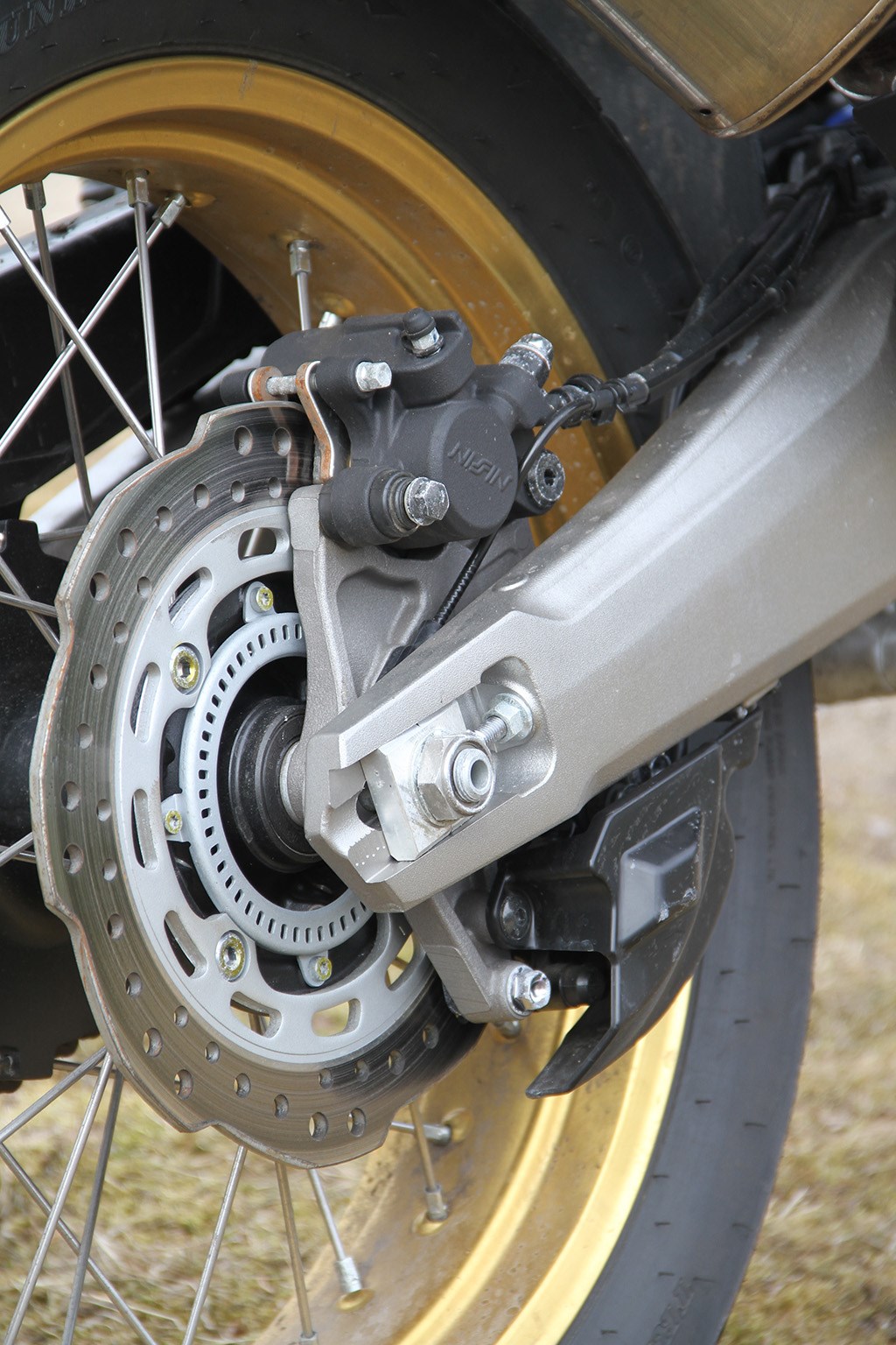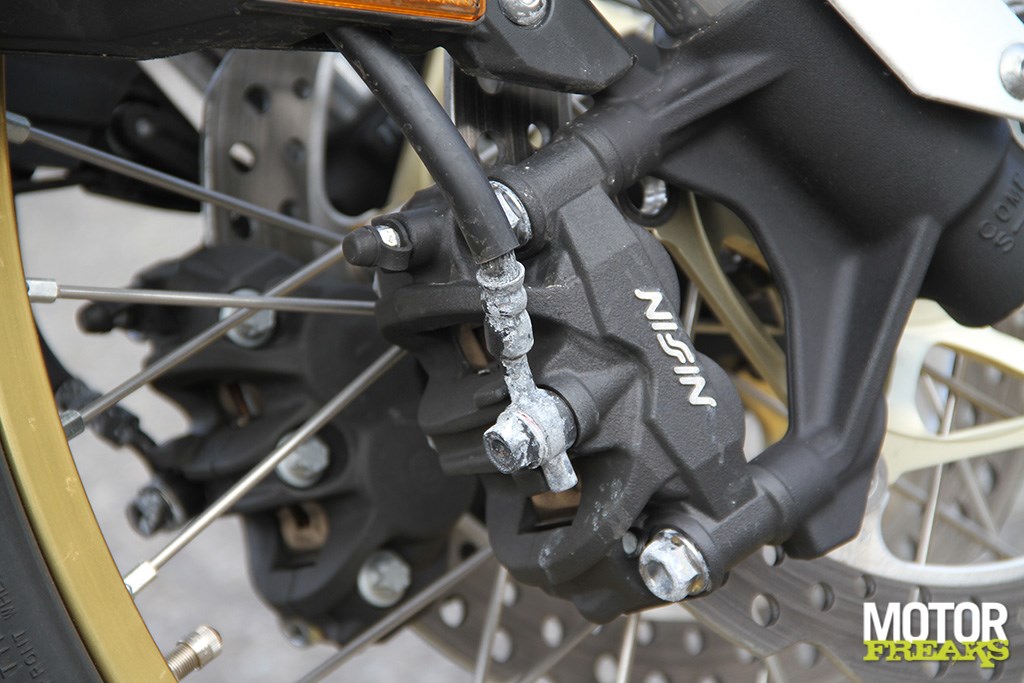 DCT, dus een extra remklauw achter voor de handrem. Vierzuiger Nissin's weten de boel trouwens tijdig tot stilstand te krijgen, maar helaas geen bochten-ABS