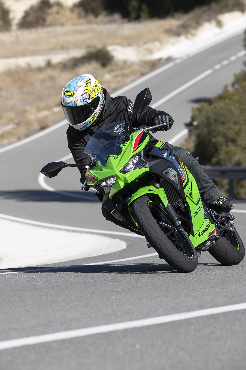 Dan het sturen, dat na het blok, de ergonomie en de styling de vierde troef is. Het gemak waarmee de Ninja 500 de bocht kan worden ingestuurd of van het ene op het andere oor kan worden gelegd is zó verbluffend dat we meer dan eens moeten corrigeren, om te voorkomen dat binnenkant bocht dwars door het gras gaan omdat de Ninja veel sneller naar binnen stuurde dan we hadden verwacht. Of gewoon te langzaam hebben gereden voor de input die de Ninja kreeg, net hoe je het bekijkt. De Ninja is daarbij zeer mooi op lijn te houden, maar is tegelijkertijd ook gemakkelijk van richting te veranderen. Dat klinkt tegenstrijdig, maar is het niet. Lichtvoetig, maar niet nerveus. Nog zo’n fraai staaltje compromis is de vering, die sportief genoeg is om de Ninja 500 helemaal uit te melken zonder dat ’t een zwabberkont wordt en comfortabel genoeg om ook over slechte wegen te kunnen raggen zonder dat daarbij de vullingen uit je tanden klapperen en je nierstenen worden vergruisd (hoewel dat laatste wel weer een pluspunt zou zijn).