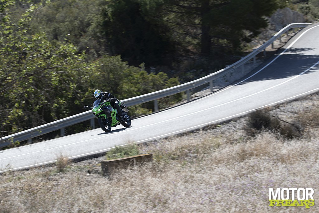 Zo niet hier in Alicante, waar het landschap er behoorlijk verlaten bij ligt. Nu is het natuurlijk wel de rustige tijd van het jaar, in de zomer zal het ook hier van de toeristen krioelen, maar dat maakt voor vandaag niet uit. “Uitsnijden en meenemen terug naar Nederland, of anders gewoon annexeren”, aldus een collega. Nu hebben we in de loop der jaren al aardig wat presentaties in Spanje gedaan, maar de route van vandaag is er eentje van de buitencategorie. Misschien niet qua hoogte – het hoogste punt van vandaag zit op zo’n 1.100 meter – maar wel qua stuur-intensiteit. Nog voordat we die prachtige bergwegen zijn genaderd, zijn we echter al enorm onder de indruk van de Ninja 500 geraakt, die op alle fronten als een volwassen motorfiets aanvoelt. Bijna alle fronten, want hij heeft wel nog steeds het extreem lichtvoetige karakter van z’n voorganger.