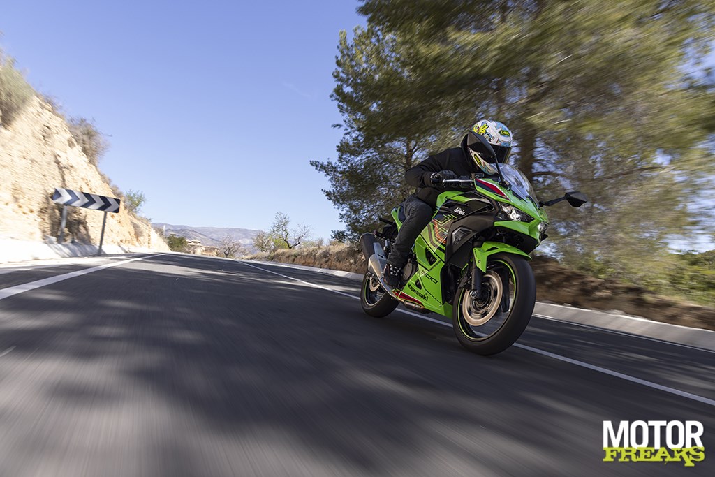 de twee inlaatkelken die verschillend van hoogte zijn, om het blok zo soepel mogelijk te laten lopen. De bovenkant van de airbox is verstijfd om ongewenst vibratie-geluid te elimineren en in plaats daarvan een veel helderder inlaatgeluid te creëren dat – zo zal blijken – als muziek in onze oren klinkt. Het uitlaatsysteem lijkt daarentegen op het oog hetzelfde te zijn als dat van de Ninja 400. Onzichtbaar voor het oog, maar wel verdomd belangrijk zijn de covers die achter de radiateur zijn geplaatst en die ervoor zorgen dat de warme lucht via de zijkanalen wordt afgevoerd, waardoor met name het rijden in zwaar verkeer op een warme zomerdag veel aangenamer is.