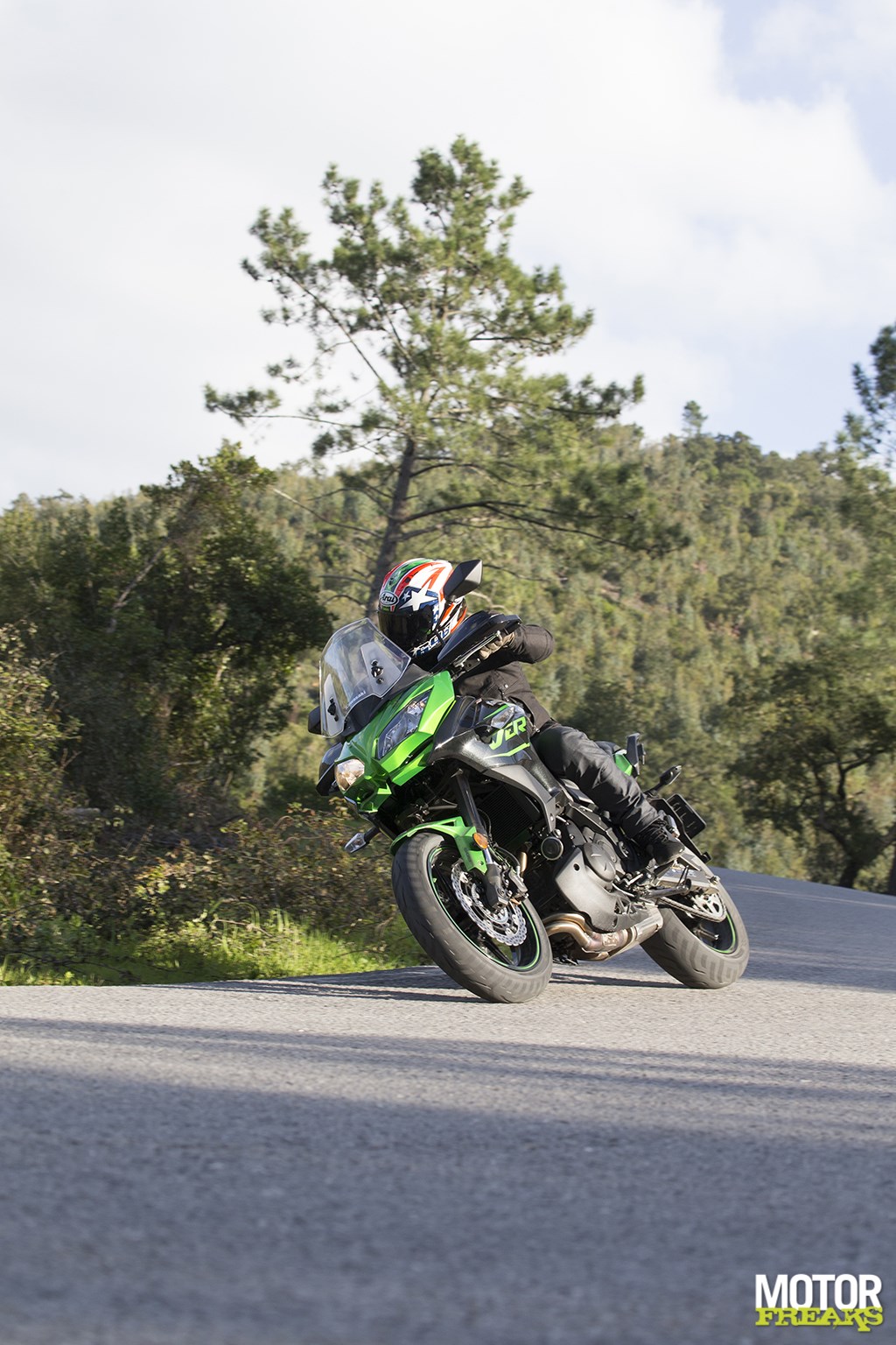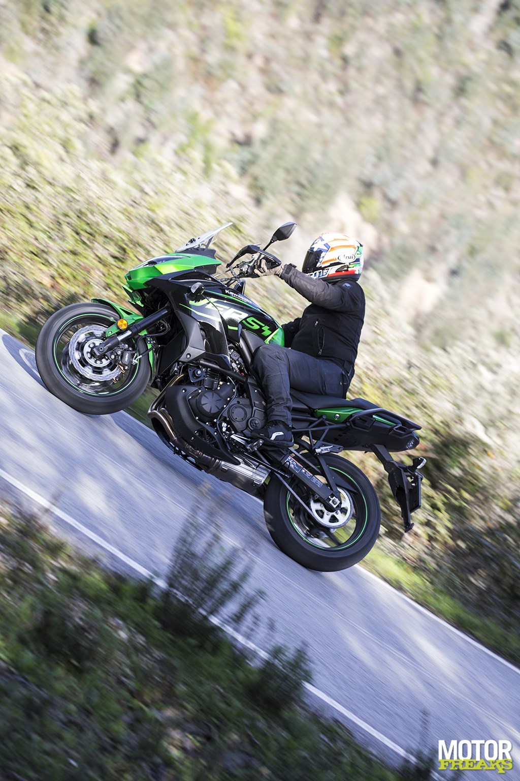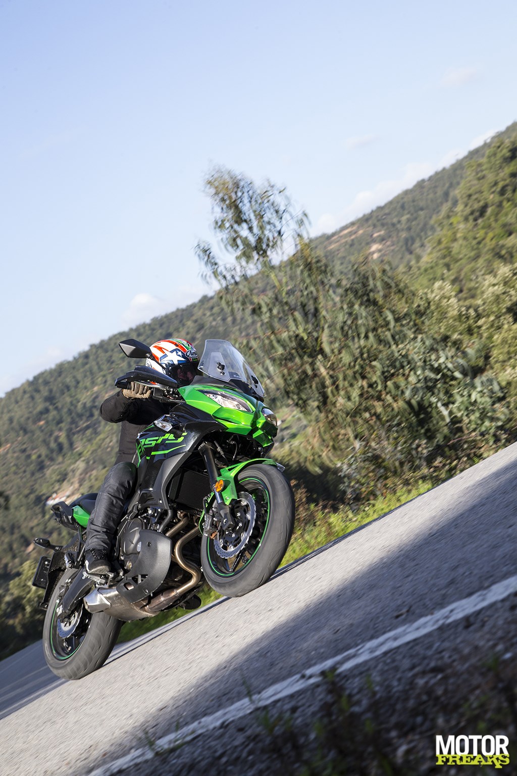 Dan is het bij ons in Nederland maar behelpen, en niet alleen vanwege het weerDe kwaliteit van het wegdek varieert van biljardlaken strak tot Leerdammer gatenkaas en van smal en krap tot breed en overzichtelijk, waardoor in een kort tijdsbestek door de Versys 650 alle troefkaarten op tafel worden gelegd. Met een kinderlijk gemak kan de Versys in elke hoek worden gelegd en het lijkt zelfs alsof de 69 pk sterke paralleltwin nét even wat frisser oppakt, terwijl er wat rijwielgedeelte en motorblok betreft eigenlijk geen aanpassingen zijn gedaan.