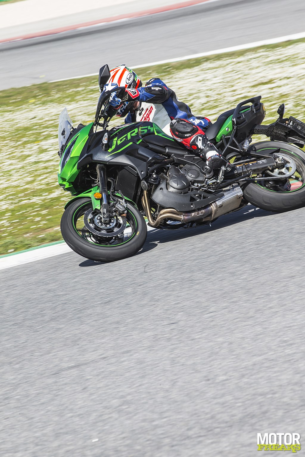 Dacht ik aan het eind van de eerste dag mijn mening over de Versys 650 al aardig bij te hebben gesteld, wordt ik de volgende dag door de Versys opnieuw aangenaam verrast. Op het Autódromo Internacional do Algarve, in de volksmond beter bekend als het circuit van Portimão, om precies te zijn, waar ik twee sessies van elk 15 minuten de Versys 650 uit mag laten tijdens het circuitdeel van de Z1000R launch, als voorrijder voor collega’s in de andere groep die nog volledig onbekend zijn met dit circuit. Wat écht ronduit kicken is. Op het rechte stuk komt de Versys weliswaar snelheid te kort, maar is daardoor wel de eerste fiets waarbij ik het gas tot aan het rempunt van bocht 1, het punt waar het circuit sterk naar beneden loopt, vol open durf te houden, terwijl de digitale snelheidsmeter nét geen 190 km/u aantikt. In het vloeiende deel houdt het rijwielgedeelte zich verrassend goed, terwijl de combinatie laag gewicht en smalle banden in de twee linker hairpins juist in het voordeel van de Versys lijkt te zijn. Nooit gedacht zoveel lol te kunnen hebben met een Versys 650 op een circuit.